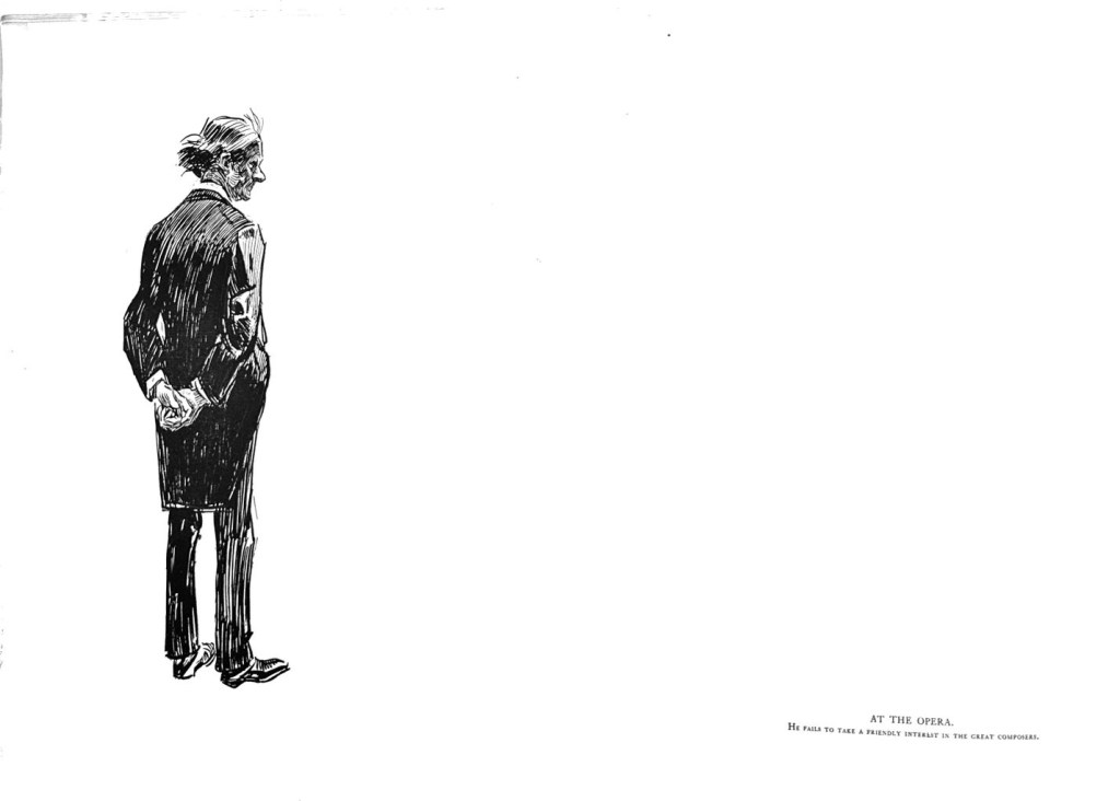 The enormous 1899 collection of Gibson’s Pipp series for Life uses its size artfully, with the main, detailed tableau of each stage of the story on the right page in immersive scale, and the left occupied by a mood-setting cameo image to the far edge of the page and the caption (often ironic) for the tableau. There is a wonderful sense of comic timing to the page by page progression across several different notes leading to the fully detailed story scene.