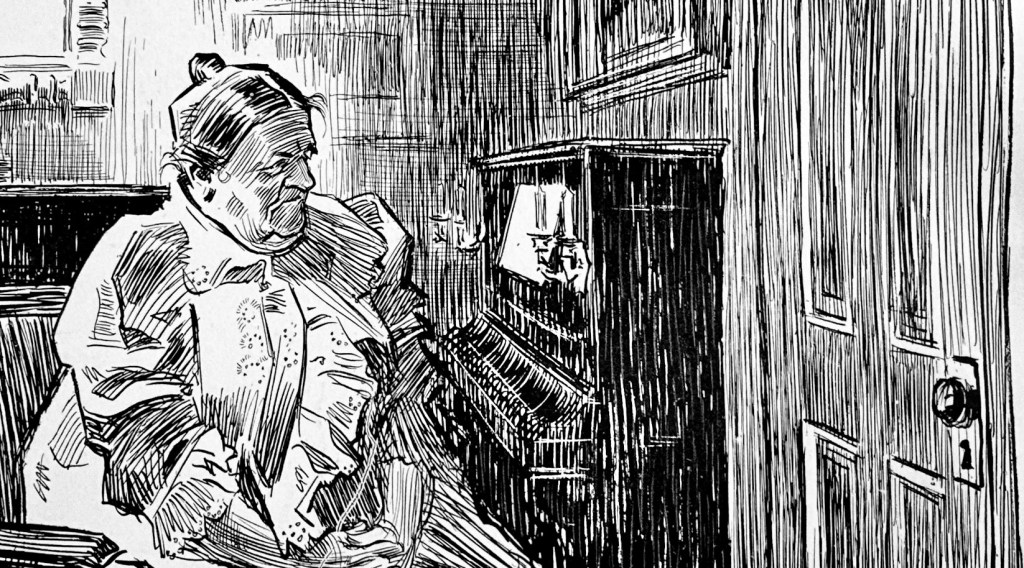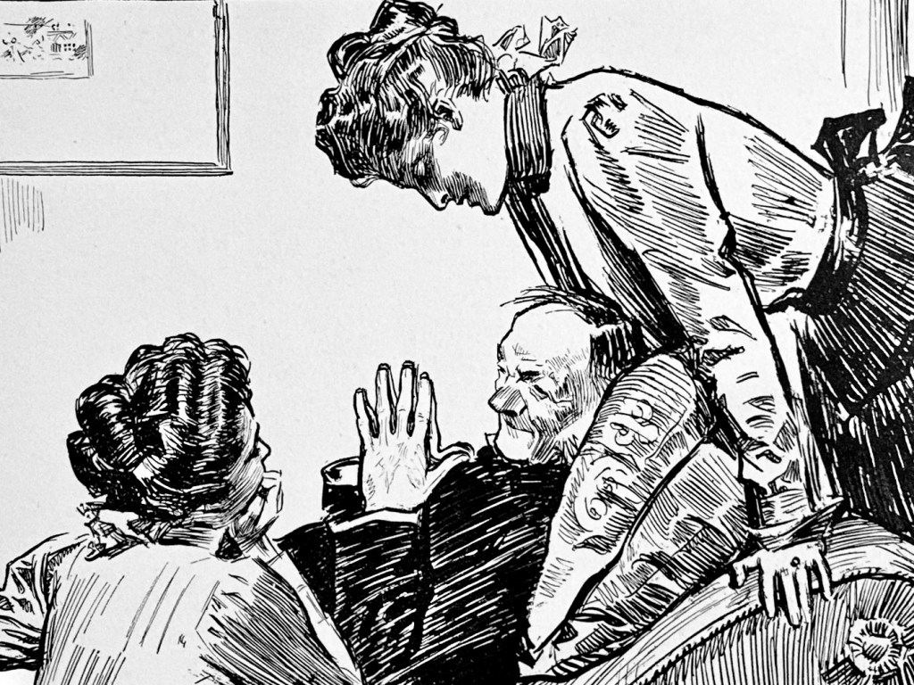 Whether it is showing Pipp struggling to look engaged at a dinner party, Mrs. Pipp scowling at a door awaiting her gallivanting husband’s return, the daughters playfully persuading their father, or the girls and their lovers anxiously awaiting Pipp’s approval of their marriage – it was all about the face. Gibson understood how in a world so stuck up on propriety, the exposed surface of the face was where drama occurred. This ewas quite different from much of early 20th Century newspaper cartooning, which generally moved from the proper parlor to outdoors, focused on the city street, physical action more than facial expressiveness. Gibson was drawing a social class on the verge of release from its own propriety. The newspaper strip was about that change, tre urban environment and diverse populations that defined that change.