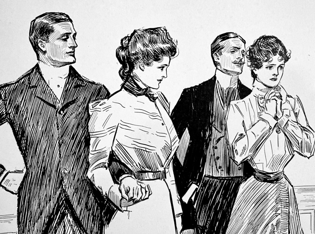 As the adventure deepens, so do the emotions. European types capture Mr. and Mrs. Pipp’s affections, and so jealousies develop. The “Gibson Girl” daughters attract the attention of “Gibson Men” who the artist depicts as just as much the spotlessly gorgeous and diffident representatives of the new middle class generation as his ladies. And this is where Gibson’s real talent for the nuance of facial expression really kicks in, where he surfaces an inner roiling emotion on the limited palette of facial expression allowed in polite society.