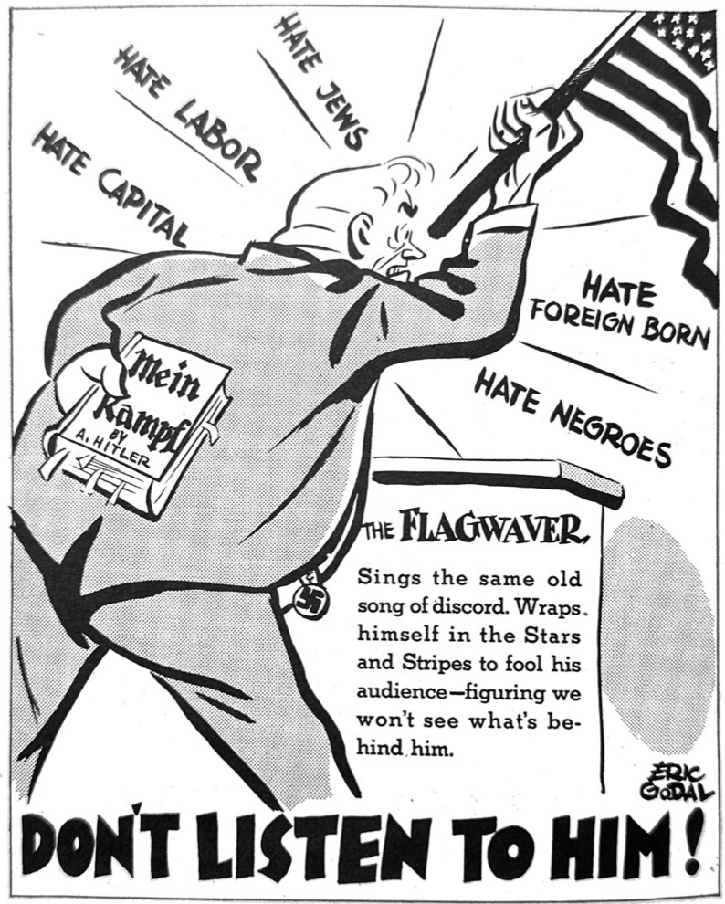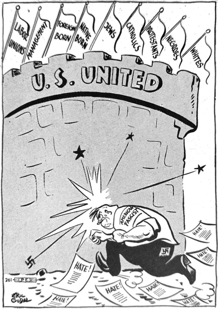 Characterizing bigots as un-American seemed to be the persistent theme. Cartoonist Carl Rose actually created an ongoing character, Mr. Biggott, drawn as a pencil-thin, blue-blooded scold with a cobweb arcing off the top of his pointy head. In one of the most expressive simple cartoons, Eric Godal draws an oafish, overfed “American Fascist” charging headlong into a “U.S. United” castle parapet flying the flags of ethnic and religious groups. “Let him beat his brains out” the cartoon advises. It is one of those rare political cartoons that explores a specific political tactic.