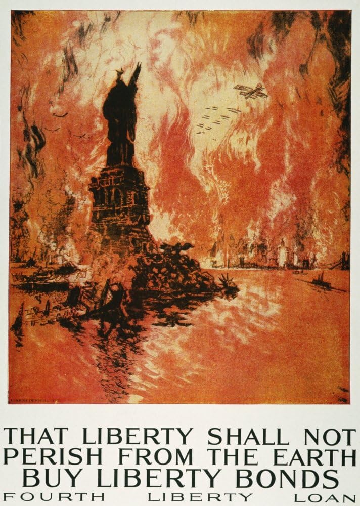 Cartoonists Against Racism does raise the question in my mind about how best to represent arguably more nuanced ideas of democracy and tolerance. In historical memory, WWI is tagged as “the war to save democracy,” while WWII is often described as a “war against fascism.” It is interesting that some of the most iconic war posters of the 20th Century come more from that first war. James Montgomery Flag’s “I Want You” recruiting poster is the best remembered. But many artists working for the CPI’s poster division used the female form deftly. Red Cross nurses became maternal revisions of the Gibson Girl, arguing implicitly that the war effort was humanitarian, nurturing. A more muscular femininity was invoked by heavy use of Columbia and the Statue of Liberty as icons of democratic principles. Compared to what I see in the poster and cartooning art of WWII in books like Cartoon for Victory, WWI artists were both creating and recalling a more sophisticated visual vocabulary to represent a war against the “Hun,” and for Progressive Era democratic ideals. WWI poster art made their case by invoking the existing iconography of democracy. Perhaps the most powerful war poster was Joseph Pennell’s “That Liberty Shall Not Perish From the Earth.” It was a dystopian image of Manhattan in flames and a destroyed Statue of Liberty shorn of head and torch. The monochromatic use of color, composition, symbol, modernist art style, plus the decapitation motif, build a gut-wrenching American nightmare.