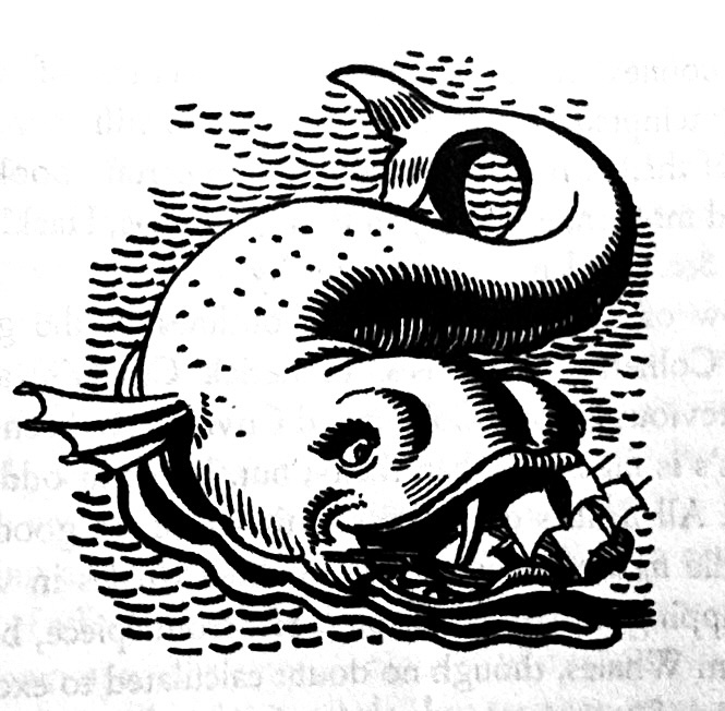 And Kent even falls into cartoonishness. Following his love of art, Melville spends several chapters in the middle of the novel lecturing on the flawed and inaccurate artistic depictions of whales. Here is where Kent reverts to comic caricature, mimicking the anthropomorphic animal style of 1920s comic strips and children’s books. In one image a rubbery, impossibly twisted whale seems to have adorable eyelashes. And yet in the next chapter on more accurate artistic interpretations of the big fish, Kent snaps back into illustration mode. Again, Kent is not illustrating so much as interpreting the text. In rediscovering Moby Dick in the 20s, scholars underscored Melville’s Ahab-like solemnity and high ambitions for this novel about God and man, democracy, fate and free will, not to mention art itself. Subsequent scholars have understood Melville’s deep connections to American humor and popular art of the day. At many points in the novel he is channeling the satire magazines of his day and even invoking the outrageousness of P.T. Barnum. Kent seemed to understand this, at least in part, before the scholars caught up. In fact, I am hard presse dot think of a book illustrator being so deeply in tune with an author than Kent’s version of Moby Dick.
