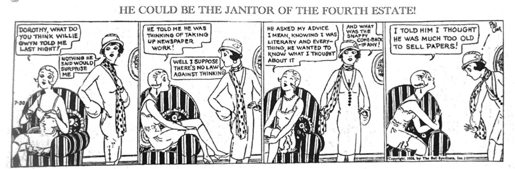 Anita Loos’s hit novel of 1925, Gentlemen Prefer Blondes, was a satire of 20’s materialism, superficial gaiety, flapper culture and wealth. Loos was a pioneering female screenwriter who had seen it all close up. Her faux-innocent gold-digger heroine Lorelei Lee became the iconic flapper. Bell Syndicate leapt onto the success and licensed the idea for a daily strip. One of the more productive “girl strip” artists of the era, Virginia Huget got her first crack at a daily with this effort, but Cook completed the short-lived series, which only ran from June to October 1926.