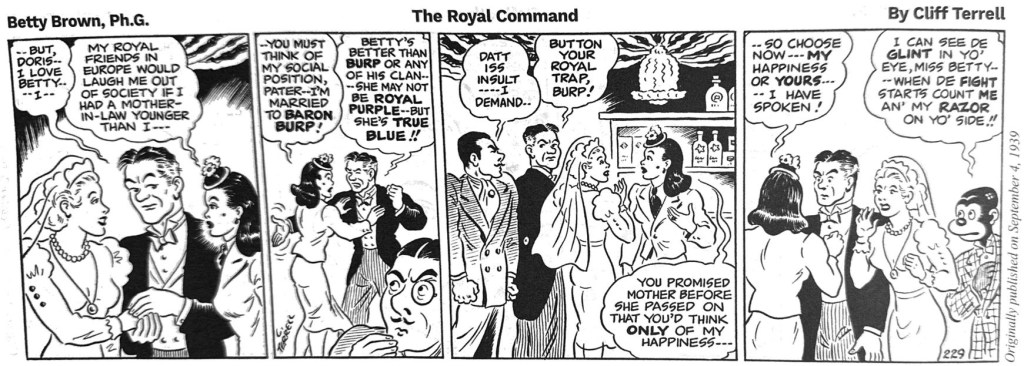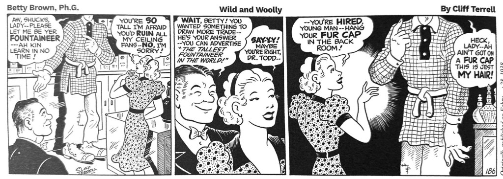The strip was unusually good for a trade strip. Mosely had a clean, cozy art style and a taste for melodrama. Rogers infused the strip with wackiness. At its best, Betty Brown Ph.G. channels some of the tone of Li’l Abner. My favorite bit of comic business in the strip is the introduction of a giant mountaineer as Betty’s new soda jerk. He is too tall to fit in the panel so we only see him from the neck down.