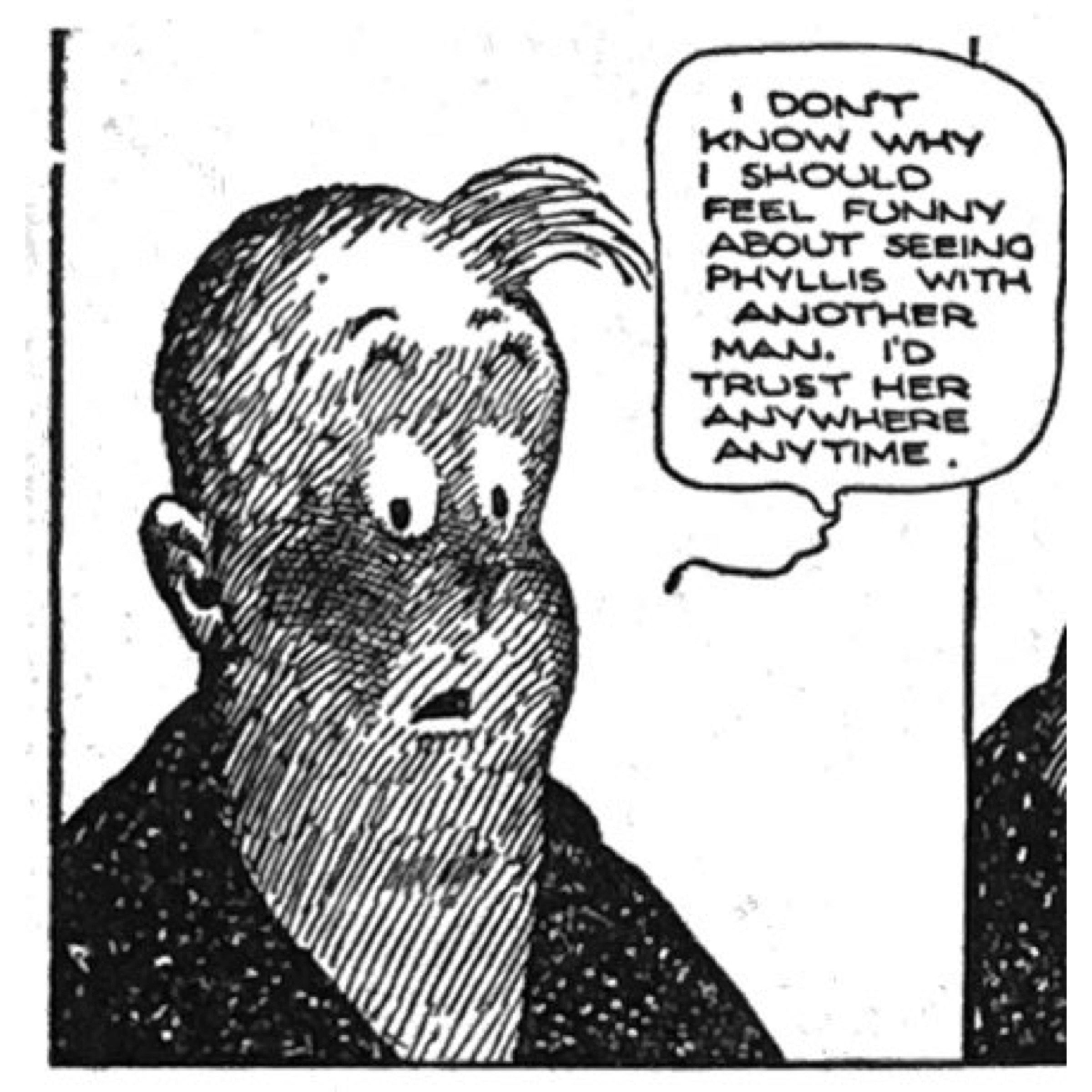Frank King’s Gasoline Alley may be the “Great American Novel” of the 20th Century we didn’t know we had. This remarkable multi-generational saga of the Wallets evolved in several panels a day across decades, exploring the domestic and emotional lives of small town Americans during a century of intense change. And in its heyday during the post-WWI era, this strip was singular in its affectionate embrace of suburban family life at a time when post-war disenchantment overwhelmed the intellectual class, when glamour, sex and emotion dominated the film arts and magazines and glitz dominated Hollywood. When more famous social commentators like H.L. Mencken, Walter Lippman and Sinclair Lewis lampooned, decried and doubted the small town American intellect – the so-called “revolt from the village” – King celebrated what Mencken called the “booboisie.” Comics historians often characterize the post-1915 period of the medium as a kind of literal and figurative domestication. As newspaper syndication expanded into every burg, the mass media business of comics needed to shave the edges off of a once-raucous and urban-focused art form. Shifting the focus to family relations and suburbia, relying on more repartee than prankish violence, made the comic strip more acceptable to a mass audience.