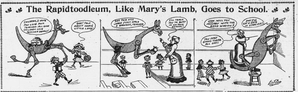 We don’t’ know if Flinn had any long range ambitions for his inspiration. It seems like it could have had legs. A wiseass, robot horse in the new city could go in a lot of directions. But as is, Rapidtoodleum is a good example of how early newspaper cartooning reimagined the city experience, the environment of nerve-wracking change and challenging social environments, in manageable ways.