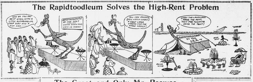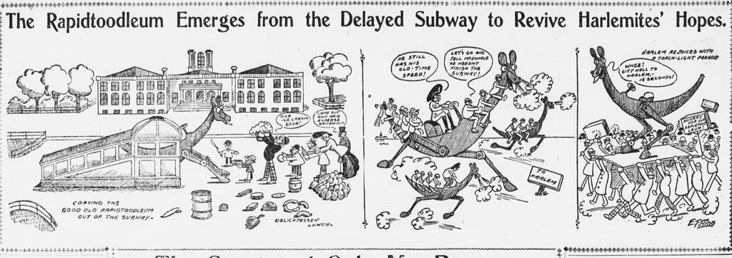 In the New York World on April 5 1904, a giant but apparently friendly robotic beast vaulted from an unfinished New York City subway entrance to address some of the city’s most pressing concerns. Daily, and for the next week, this cartoon “Rapidtoodleum” offered rapid transit that solved for a much-delayed subway project, exposed gambling in Harlem, proposed an alternative to overpriced city housing, outpaced a newfangled automobile, and lampooned the florid fashion in women’s hats.