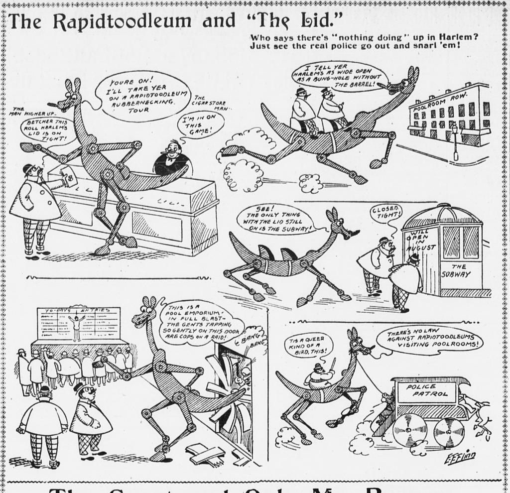 The Rapidtoodleum is a kind of throwback automaton, a cartoon fantasy that marries the modern with the pre-modern. By 1904, the war between automobile and horse was at its peak, and it was emblematic of the tectonic shift from an agrarian past to an urban and fully industrialized America. Cannily, the Rapidtoodleum has it both ways. Flinn’s steed, both googly-eyed and robotic, barges into different aspects of modern urban life, at different times arrogant and humbled, resentful and satiric. The strip makes several references to the much-delayed, budget-busting New York subway project. He crashes the emerging consumer culture and its addiction to fashion and prestige by tossing a salad into a hat decoration. He mocks the perennially delayed promise of underground mass transit by getting from Harlem to City Hall in 15 seconds. This talking, smoking, boastful and even snarky robot stallion feels like a clever rejoinder to the new age of engineering, consumption and technological hubris. Flinn imagines a machine that is all too human in so many ways.