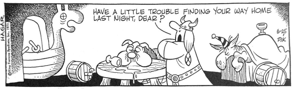 And there were some pretty good gags along the way. I especially like when Browne reverted to a single long panel to let the viewer piece together the elements of the joke. “HAVE A LITTLE TROUBLE FINDING YOUR WAY HOME LAST NIGHT, DEAR?” Helga asks the bed-ridden Hagar as the prow of his boat pokes through the front door. And I am always up for a little barbarian humor. When Hagar muses about just wanting “a little land to call my own…” the kicker panel blurts “…like Europe.”