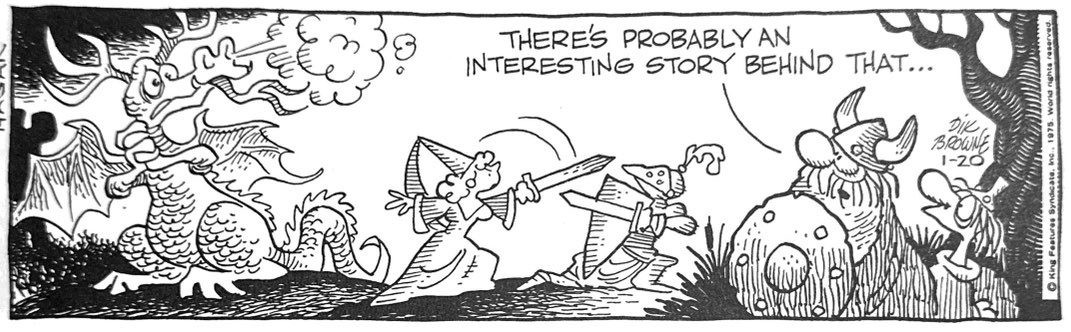 And also like most successful comic strips, it was at the intersection of art and commerce. Brown was already enjoying comic success in his partnership with Mort Walker on Hi and Lois. But as his eyesight declined and his career longevity seemed unclear, he wanted a more lucrative project that might involve the family itself. He worked very deliberately on crafting the right marketable project when it struck him that two google eyes between a horned cap and bulb nose had possibilities. Hagar the Horrible, his domineering wife Helga, bookish son Hamlet and conflicted feminist daughter Hony emerged as the perfect pre-modern sitcom family. King Features pre-sold it into 200 papers at start on Feb. 4 1973, but it soon became their fastest growing strip. By 1978 it was in over 1,000 outlets, with regular paperback reprints and a hearty merch and licensing business. Recruiting family members into an incorporated business entity, Papa Brown got that hoped-for long-term security for his tribe. Dik’s son Chris, who had contributed all along, took over the strip in 1989 after his father’s death.