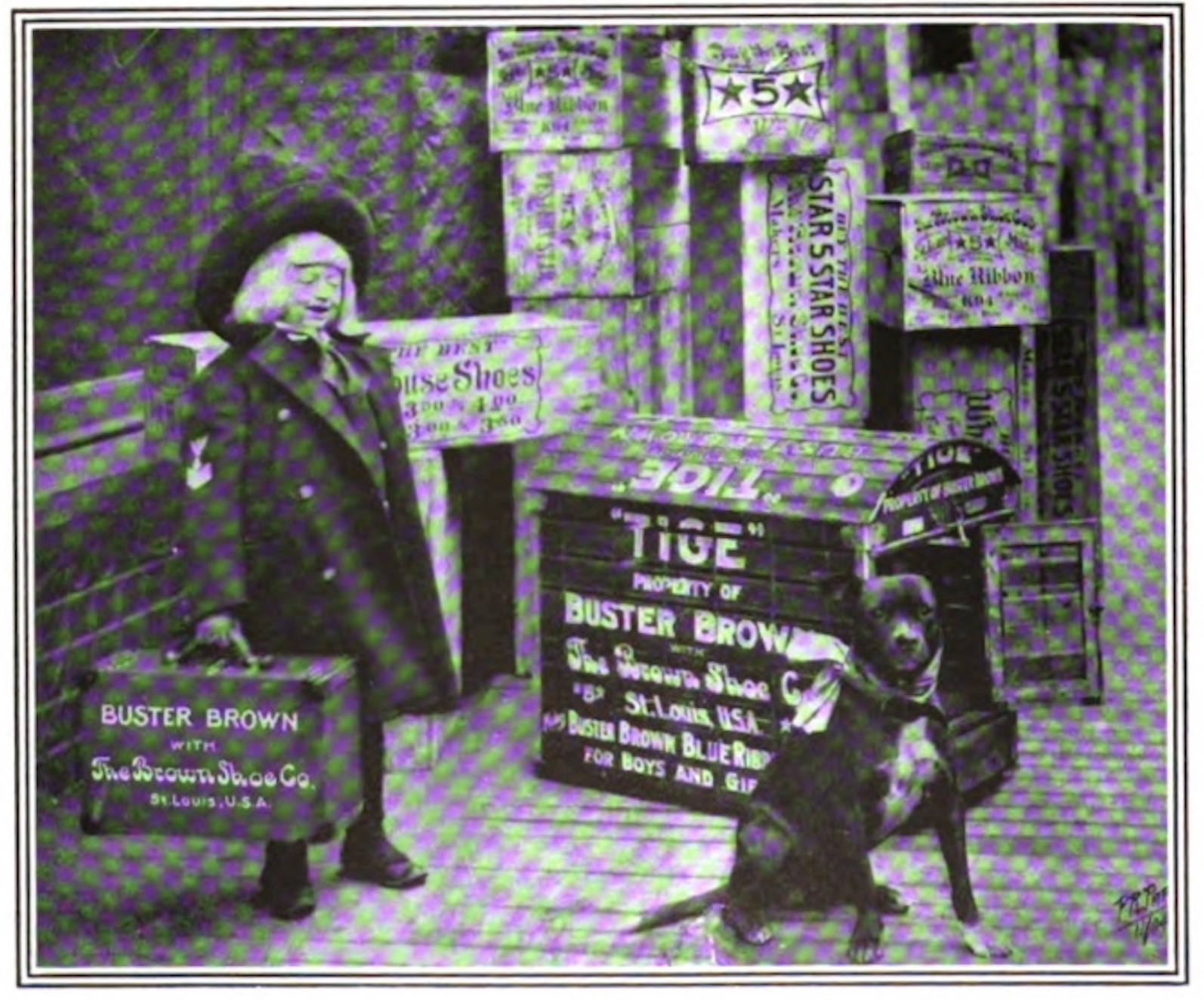 Dubbed “Reception Tours,” the model provided for a Buster actor and a Tighe for day-long visitation to the retail outlet to drum up attention and drive shoe sales for the shoes. According to the St. Louis government’s history site, the Brown company hired up to 20 “midget” actors and trained dogs to staff the many road shows, which ran until 1930. But a forgotten article, “Buster Brown, Advertiser” in the obscure trade paper Profitable Advertiser gives us a more detailed look at “how the scheme is worked.” Retailers who agreed to buy at least 50 dozen pairs of Buster Brown shoes could access the program from Brown. The company provided a package that included the talent as well as marketing templates for local newspaper ads and handbills which the retailer agreed to buy in support of the Reception.