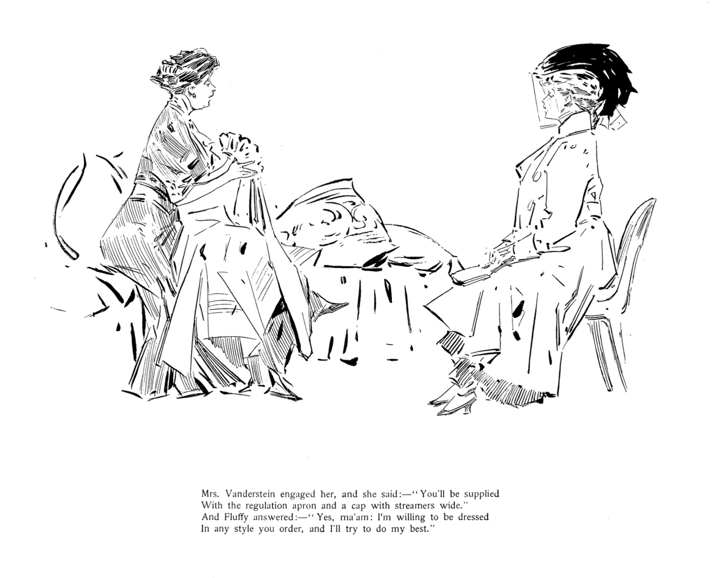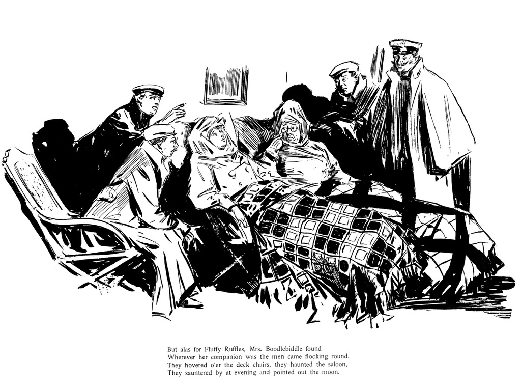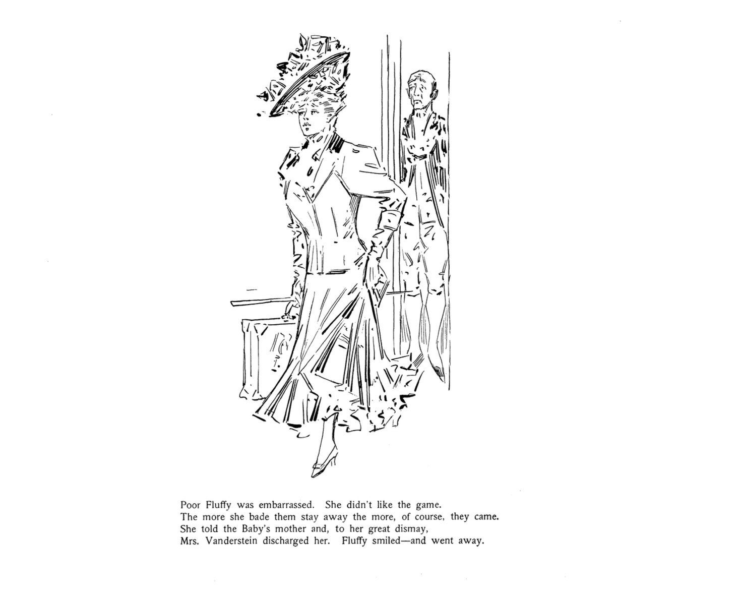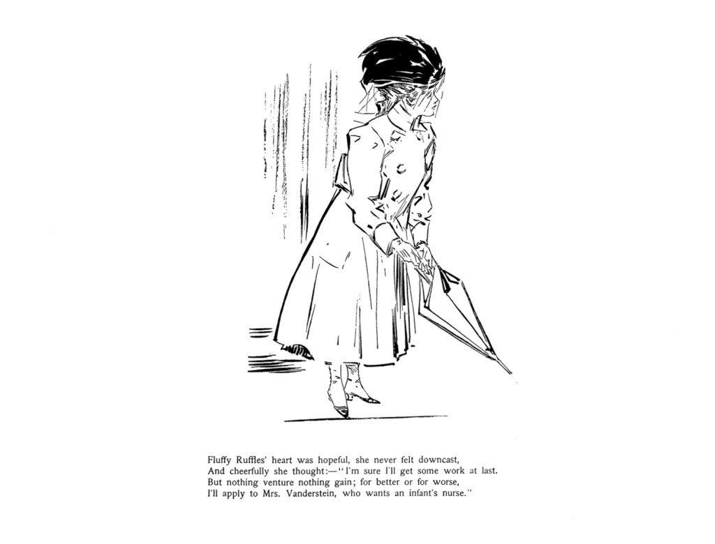 And yet, in the opening months of Fluffy’s adventure into the work world, her own feminine attractiveness is her biggest enemy. Whether trying to become a florist or traveling companion, dance instructor or waitress to a rich family, she runs into the same problem. Men swarm her with attention. Inevitably, employer frustration, feminine jealousy or Fluffy’s own discomfort ends the job.  “To have a girl like that around would never, never do,” muses the florist. While a regretful wealthy employer “wept on Fluffy’s shoulder as they said their sad goodbys-/Yet she couldn’t have a waitress with such fetching violet eyes!” While Wells did not seem willing to engage in genuine social satire, it is clear that while Fluffy may be ready for the world, the world is not wquite ready for Fluffy.