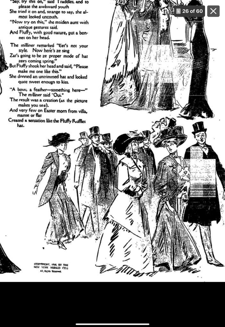 2. In the last few years, a few Women’s Studies scholars have surfaced Fluffy as an early depiction of middle class women entering the workforce. And some fashion history notes that her style became a sensation in 1907-1908. The general histories and anthologies of comic strips, however, overlook Fluffy Ruffles entirely. ↩︎