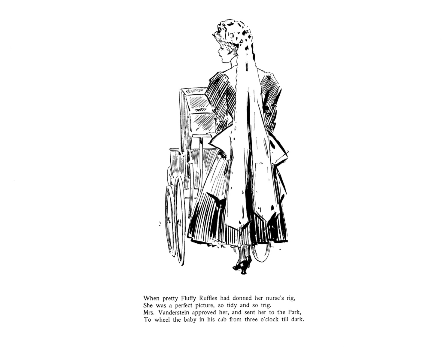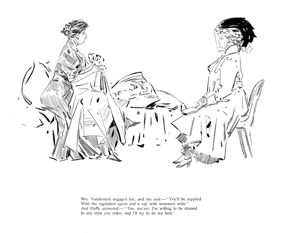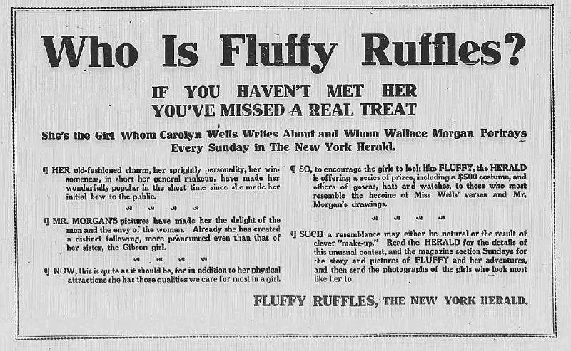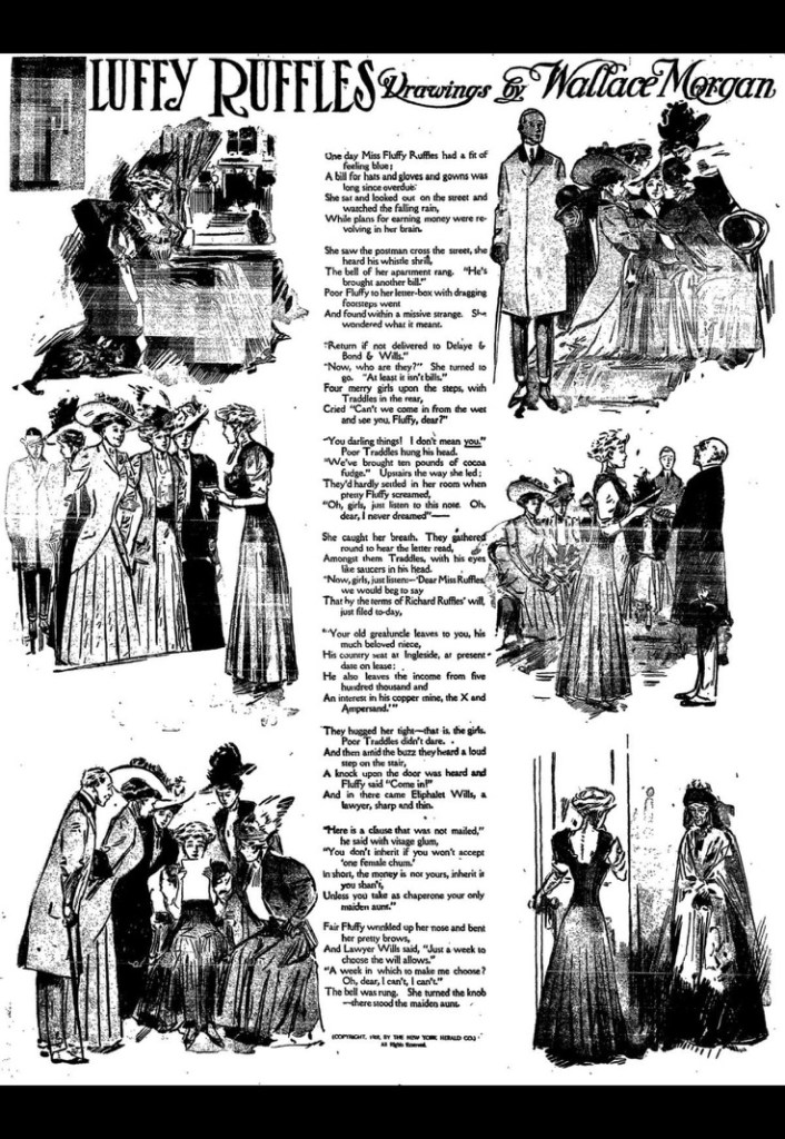“Bah, for Mr. Charles Dana Gibson,” declared the Spokane Press in early 1908. Who needs the signature Gibson Girl anymore. “Miss Fluffy Ruffles is the newest type to which all the girls aspire.”1 The job-hunting, resourceful, and decidedly independent heroine became a national sensation shortly after her Feb. 3  premiere in the New York Herald. Fluffy was a pioneering woman in the workplace battling a reversal in fortune by making weekly tries as a journalist, florist, schoolteacher, dairy maid, waitress and more. The full page Sunday story was conceived and told in comic verse by a professional woman of note herself, the children’s and mystery writer Carolyn Wells. Herald illustrator Wallace Morgan dramatized the tale in vignettes that seemed to channel Charles Dana Gibson’s genteel magazine style. The series ran until early 1909 and quickly a multimedia juggernaut. The early episodes of her job-seeking stage were reprinted in book form before 1907 ended. Within six months of the launch The Herald started contests to find real-life Fluffy Ruffles that migrated to partner newspapers around the country. Paper dolls, chocolates, sheet music, branded hats and suits, even cigars, soon carried the Fluffy Ruffles brand. A 1908 Broadway musical production would travel the country until at least 1910, a year after the strip itself had ended.