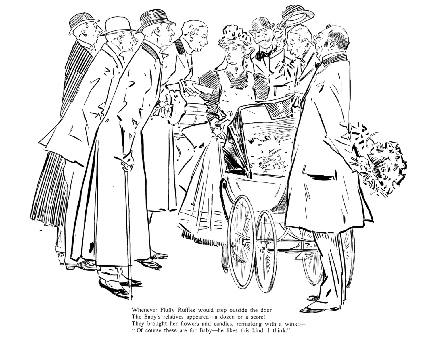 The series evolved by the end of 1907, as a new inheritance saves Fluffy from the work world. For the rest of the run, she becomes a traveling dogooder who solves social problems and rescues the unfortunate. Fluffy sees a woman struck by a speeding car, pursues the rich owner and extracts payment for the fallen lady. A starving artist is faint from hunger so she buys his paintings and uses her fame to attract more business for him. She uses her wiles and ingenuity to rekindle an aging husband’s ardor for his wife. When Fluffy tries “settlement house” work to educate factory working girls, the class is wildly popular becasue the girls want to learn mainly about her clothing styles. And she takes ownership of her celebrity and famous charms, lending them to a local armory commander who is having trouble marshalling his tropps for drills.Her kind face is even powerful enough to soothe an escaped raging zoo tiger. In essence, Fluffy Ruffles settles into being a kind of genteel super-heroine, resolving incidents, reversing misfortune, inspiring good deeds. But the essence of Miss Ruffles is that she is relentlessly unruffled. Her beauty, poise, confidence and optimism stand fast against many circumstances of modern city life she encounters.