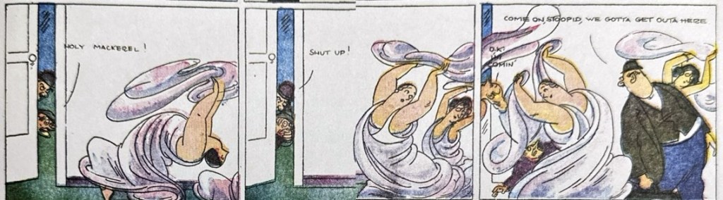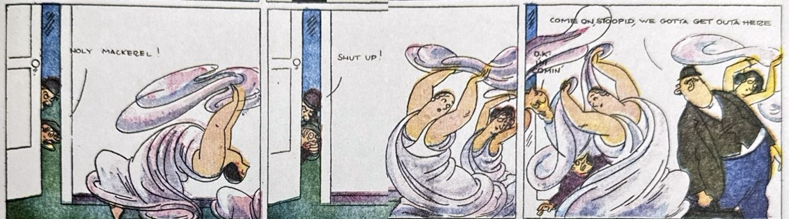 In the best strips, Irvin pushes outside his comfort zones into absurdity. When Margie dreams herself into a garden of monster flowers and vegetables, Irvin gets to merge his sense of mass and color with whimsy. And Margie’s thwarted attempts at refinement and cultivated pursuits are golden opportunities to put that massive canvas into comic poses. He takes a rare dip into current affairs in a 1933 strip that puts John into a secret society of fasci-adjacent “Red Shirts” bent on nabbing dangerous “alien” intruders. They get mistaken for porters at the train station. The humiliating twist is enhanced by those blousy, vibrant fields of red shirts that look more silly than menacing. Nicely done.