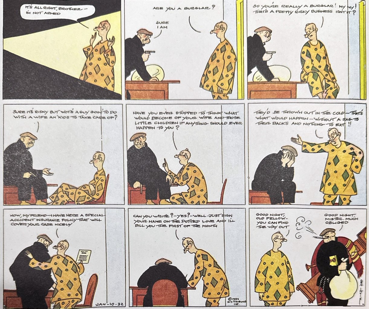 That wispy, inconsequential spirit is apparent in Irvin’s strip as well. The Smythes’ social class is not always clear, which may be the point. They have a cook and maid. John belongs to a country club. Margie’s socializing and hobbies suggest familiar upper-middle class status anxiety. And yet, John has to hit up his rich uncle to cover the month’s mortgage at one point. The only signs of the surrounding global Depression are occasional hobo and burglar cameos. Most of the humor feels ported from The New Yorker – small ironies and minor marital annoyances. John spends too much time dancing with a younger woman at a party. Margie’s fox hunt dogs stray and raid the local butcher. John surprises a burglar, only to sell him an insurance policy. Margie drags John to a packed party yet complains about taking the subway home because of the crowds. Droll. Very Droll.