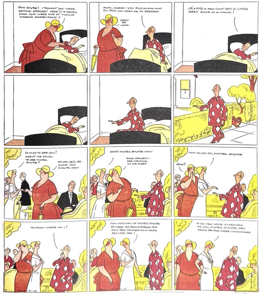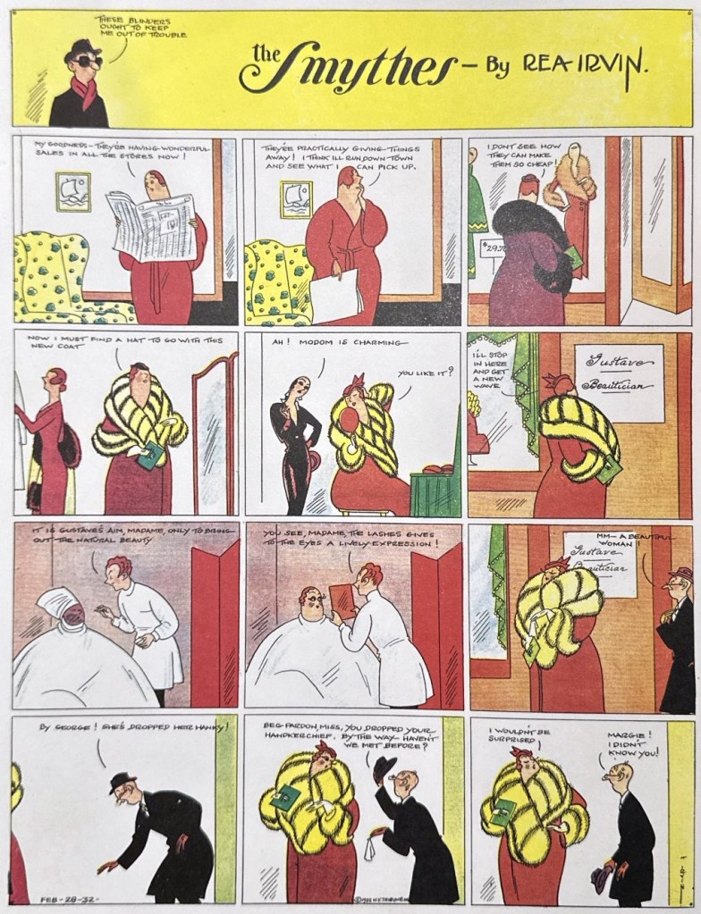 If you let the original art designer of The New Yorker loose on the Sunday comics page, then Rea Irvin’s The Smythes is pretty much what you would expect to get. For six years in the early 1930s, Irvin rendered the foibles and class anxiety of upper-middle class ex-urbanites Margie and John Smythe with impeccable Art Deco taste and reserve. Could we get anything less from the creator of Eustace Tilley, the monocled, effete and outdated New Yorker magazine mascot who appeared as the inaugural cover in 1925? Irvin was also responsible for the design motifs and even the typeface (“NY Irvin”) still in use at the fabled weekly. And The Smythes newspaper strip carried much of that magazine’s class ambivalence and self-consciousness, its droll observational humor, as well as its lack of real satirical edge. The Sunday feature ran in The New York Herald Tribune from June 15, 1930 to Oct. 25, 1936. It was among the most strikingly designed and colored pages in any Sunday supplement, even if its humor may have been too dry for most readers. Beyond the Trib, The Smythes only ran in about half a dozen major metros.