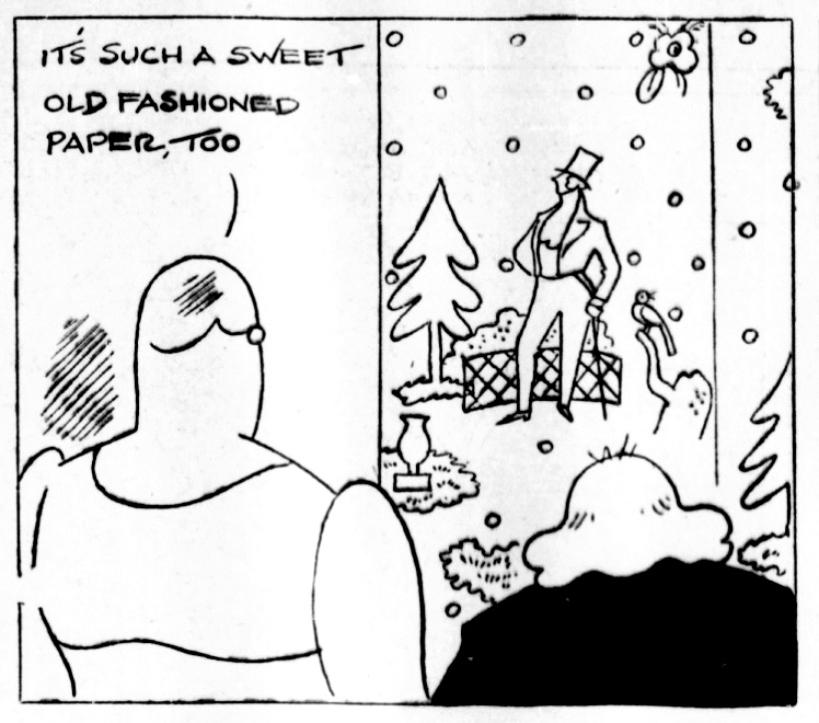 The typical sitcom foil of generational tension goes missing here as well, because the two kids, Willie and Maude, are visually and practically ephemeral to the strip. The editors of this reprint limited their selection to the first five years of strips, avoiding the introduction of the zany family Grandpa character in the final years. The rotund, big-bearded Grandpa may have been a last ditch attempt to infuse The Smythes with some comic strip craziness. He was a prankish wag and delusional braggart who does have a distinct comic voice, name-dropping his many royal acquaintances. He introduced some promising chaos to Irvin’s starched collar world. In one strip, Irvin even pokes at the pretenses of his own New Yorker and puts Eustace Tilley onto wallpaper that Grandpa mangles into a Cubist nightmare for Margie’s walls. His interactions with the outside world and within the Smythe family could have developed into something in different hands. But, to be blunt about my reading of The Smythes, Irvin strikes me as an uptown magazine artist who is slumming a bit in the newspaper world without an appreciation for how serialized comics pages really work. He’s visiting a jazzy downtown neighborhood but isn’t really hip to the beat.