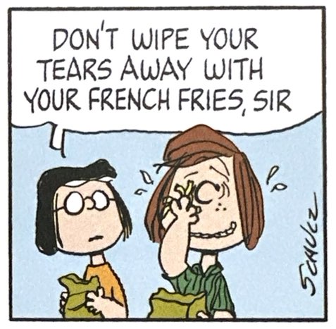 And so Essential #19 is a two-week sequence of dailies chronicling Linus’ attempt to quit his security blanket cold turkey in 1960. Essential #35 finds Charlie Brown taking a line drive in 1967 that violently, comically flips and disrobes him. Evanier adds several other cases of Schulz’s approach to physical mayhem. Essential #50 captures the quintessential Peppermint Patty/Marcie dynamic played out when Patty improbably wins an essay contest in 1985. Evanier recounts how at this point in the strip Patty and Marcie almost seemed to take over the strip as Schulz delighted in pitting Patty’s irrational impulsiveness against Marcie’s officious realism.