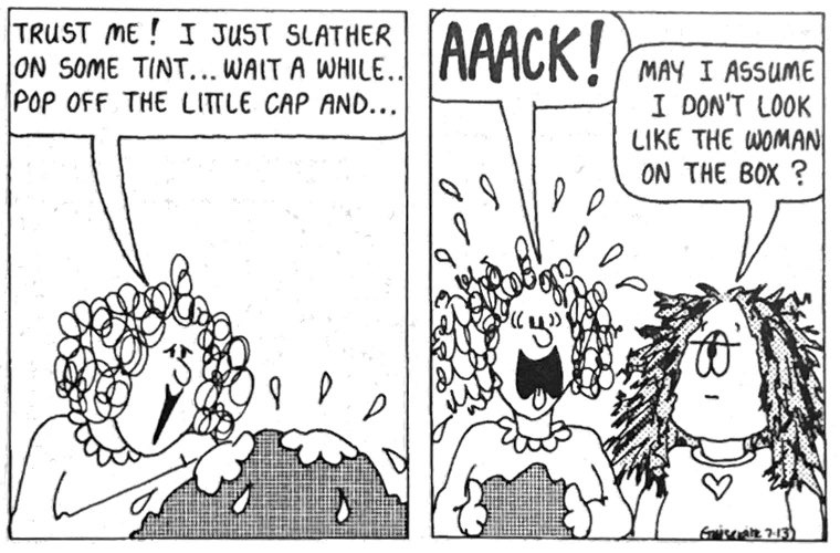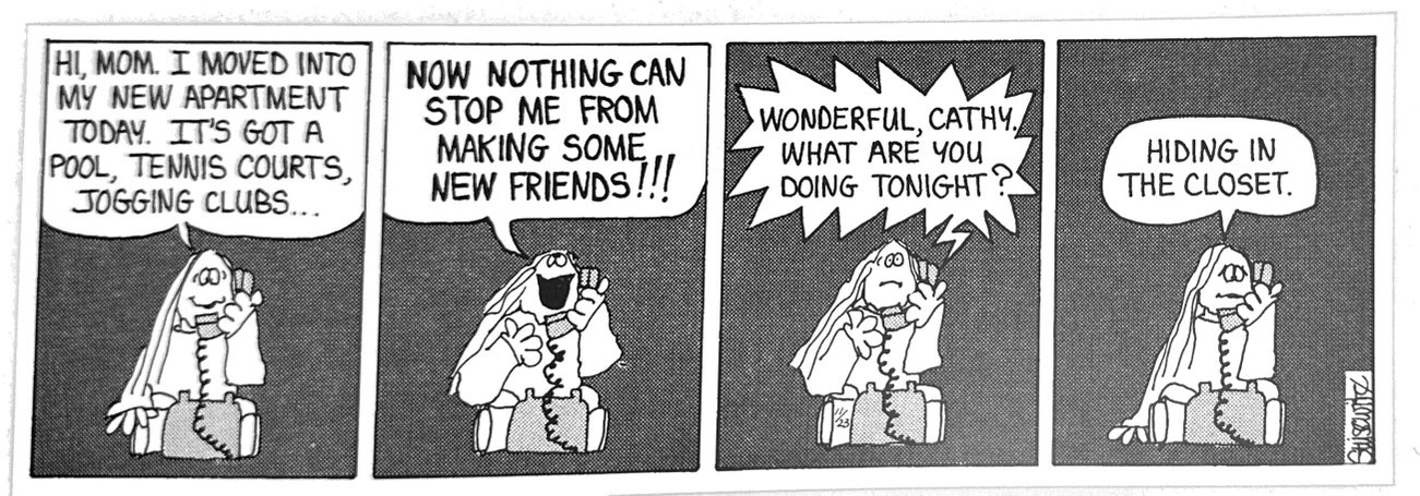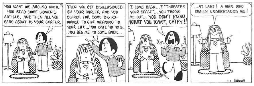Artistically, the strip was among the crudest on the comics page. The massive round heads, rectangular limbs and misshapen objects carried little expressive weight, except perhaps when Cathy freaked out. Then, her explosive, poker straight hair did all of the talking. The basic character design, no nose, scrunched oval eyes, long straw embodied her sunken spirit. The strip looked like the offhand scribblings in a teen diary. Which is exactly what they were, and was essential to the strip’s charm and audience identification.