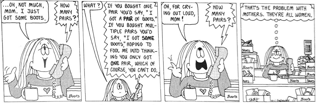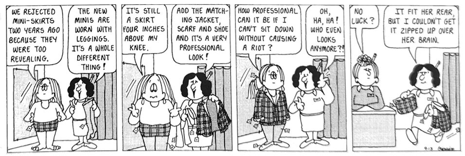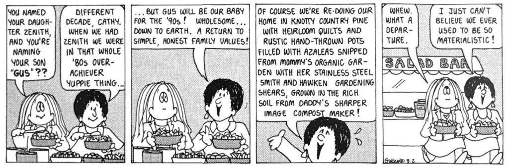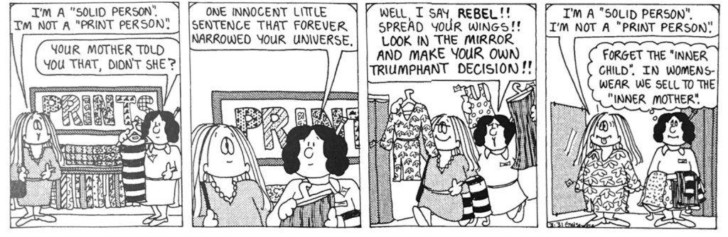Cathy was at once bemused, repulsed, cowed and enticed by it all – both critical and complicit. The best the modern citizen/consumer can hope to do, this strip suggested, was try to filter signal from noise, try to put up a good ironic front against the marketing rationalizations and our own self-delusions. And by the way, we have just the right shoes to go with that look.