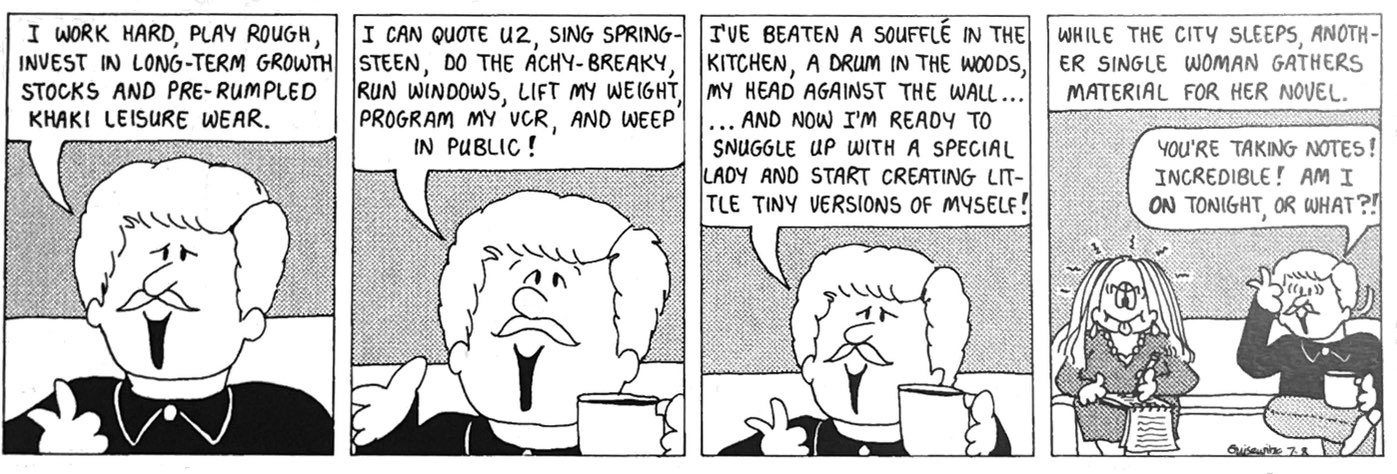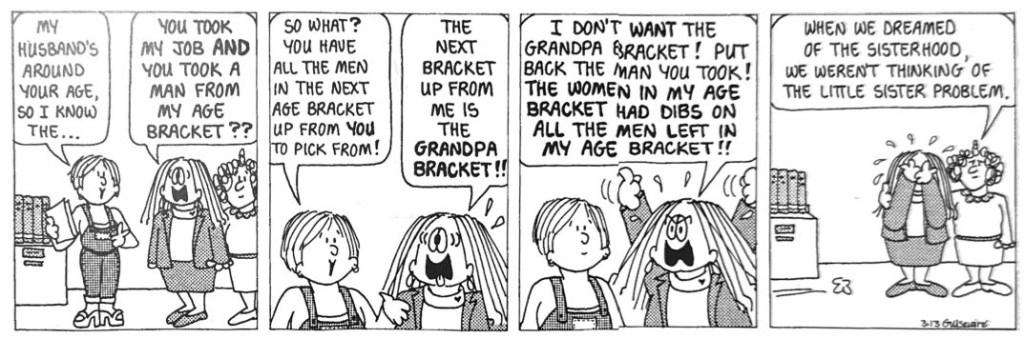 Beyond ideologues who found Cathy too wishy-washy about her own stated principles (aren’t we all?) there are more legitimate criticisms of the strip. Even though the honchos at Universal assured Guisewite  that she would overcome her limited artistic skill by producing 365 strips a year, there is little evolution of that over the decades. As charming as the scribble motif may be, it really does limit the expressiveness of the characters. The impact of the content is all declarative because the typical tools of cartoonery – gesture, posture, glance, don’t seem available here. The comic timing and cadence of panel progressions often fall flat as well. There is no thoughtful use of composition to speak of. And too often, the Cathy strip forgets its own strength in making the political/cultural personal. At its worst, Cathy gives us too many anodyne sociological sermons – on silly parenting and fashion trends, on growing serving sizes, etc. Didacticism is usually the enemy of good art. Beyond Cathy and her mother, most of the other characters are used to make declarations rather than reveal parts of themselves. As a result, the strip never creates a world and rich population of its own.