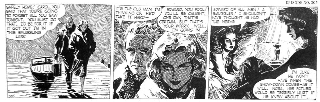 Speaking of photo-realists, the great gang at The Slingsby Bros. Ink have been on a crusade to resurface the wonderful Carol Day soaper by the enormously talented David Wright. We already dug into the massive and expensive inaugural volume reprinting original art of one story arc at 1:1 scale. Barely known in the U.S., the UK strip ran in the 1950s and 60s followed fashion model Carol Day through the rich and stylish environs of England and Europe when those world were establishing modern style. Wright, who had been a very successful print ad illustrator and favorite pin-up artist during the war, made the most of this world in what must be counted among the most beautifully illustrated strips of the post-WWII period.