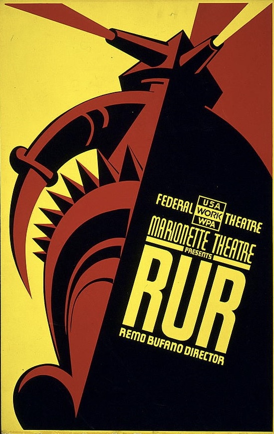 Good liberals like myself were raised to romanticize all things associated with FDR and his New Deal. At first blush, this imagery feels like visual comfort food as some enduring post-WWII liberal shibboleths get rehearsed here. The dignity of work, union power, partnerships of industry and agriculture, government and business, are all glamorized and fundamental to Roosevelt’s Machine Age idealism. As well, while the strength of ethnic diversity itself is not explicitly argued in many of these images, the value of specific ethnic history and culture surfaces in promotions of the FAP theater work. Black history and Yiddish theater especially are prominent. As well, all of this is wrapped in a benign nativism that was a part of 1930s culture. A key distinction between these WPA posters and, say Soviet Realist poster art, with which they have stylistic similarities, is the absence of collectivist fantasy. There are few if any crowds in WPA imagery. Much like the previous great government-sponsored propaganda project, WWI posters, these images sell collective effort with individualist appeals. Finessing the tension between social obligation and individual autonomy is as American as, well, the Constitution that outlined those competing interests.