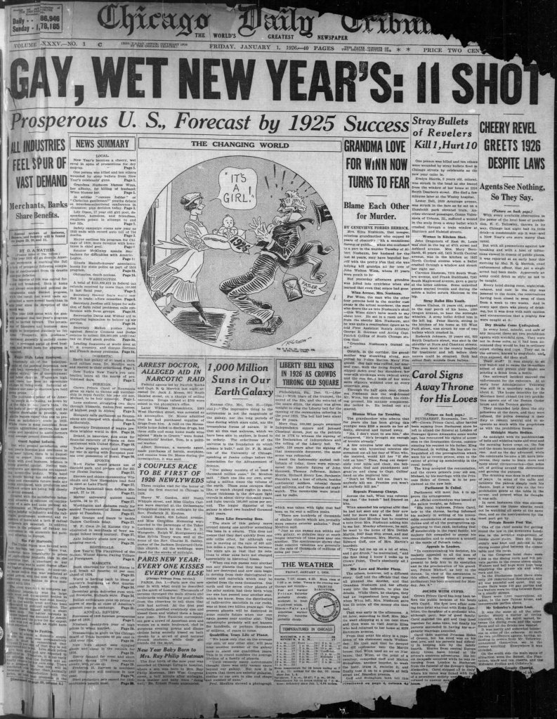 New Year’s Day in Chicago 1926 felt like peak 1920s. The common tropes of the “Jazz Age” congealed on the front page of Tribune: “Gay, Wet New Year’s: 11 Shot – Prosperous U.S, Forecast by 1925 Success” barked the headline. Front page stories reported that the manufacturing and consumption were driving demand-side growth to new levels. Meanwhile, casual gunplay celebrating New Year’s Eve resulted in one dead child and multiple woundings. And at the height of Prohibition, citizens and journalists openly mocked officials trying to enforce alcohol bans in the local nightclubs. According to The Trib, two barely guised Prohibition agents were assigned to each club, while revelers succeeded in hiding their hooch throughout the night. One club crowd had had enough and chased the agents out the door. The cops refused to intervene, claiming that they wanted to remain “neutral.”