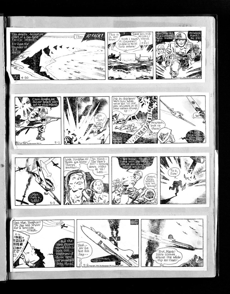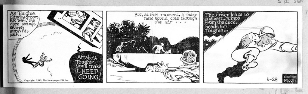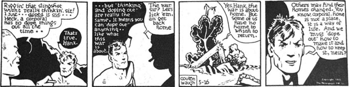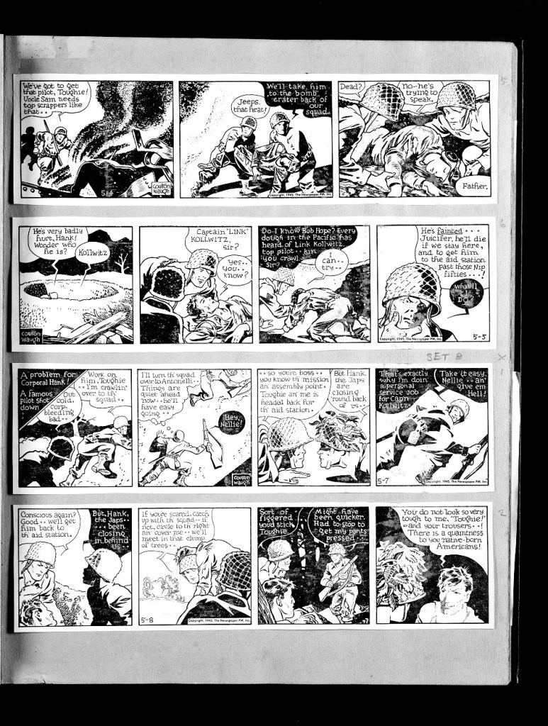 Hank was at its most didactic during the inaugural months when Waugh eagerly signaled the strip’s left/populist alignment with PM’s mission. At Hank’s launch, both war fronts approached Allied victory, and Waugh frames the effort as a war for pluralist democracy. Despite casual hatred for “Jap” and “Nip” foes, Hank’s heterogeneous squad is a roll-call of ethnic names and regional roots. Their rescuer is the “well-trained Negro” grunt Jerry Green, who becomes the first recurring Black character in a non-Black newspaper comic to avoid ethnic stereotyping. Even the late Capt. Killowitz was a German emigree who embraced Allied ideals. In sum, Waugh frames American democracy and identity are grounded in shared ideas and ideals, not ethnic or blood origins. And Hank himself emerges as a natural democrat. Even while claiming to be a grease monkey who lets “others do the thinking” Hank jerry-rigs a grenade throwing slingshot to neutralize a sniper. “That wuzn’t thinkin’. That was just my reg’ler stuff like fixin’ cars back home,” a knack for “doping things out,” he tells Kollwitz.