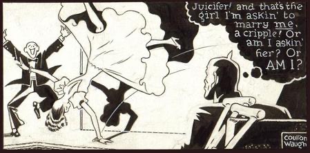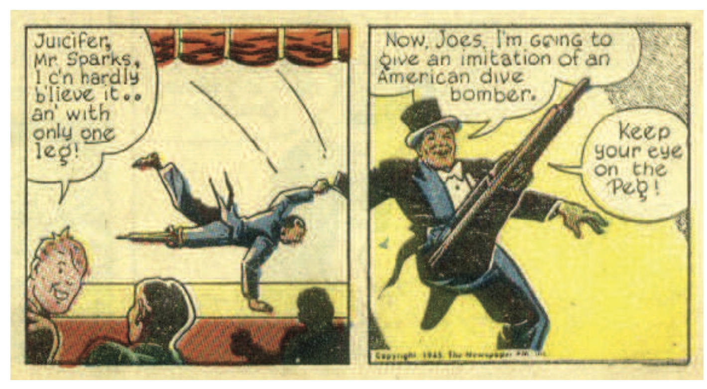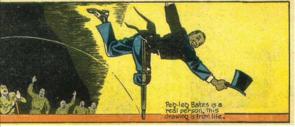 - As the panel suggests, the amputee entertainer was based on a Broadway headliner, Peg Leg Bates. The son of a sharecropper, Bates lost his leg in his adolescence from a cotton gin accident. He turned the handicap into feature act. Waugh’s panels depict the reported climax of Bates’ routine – a flying leap that lands and then spins upon his reinforced peg leg. ↩︎