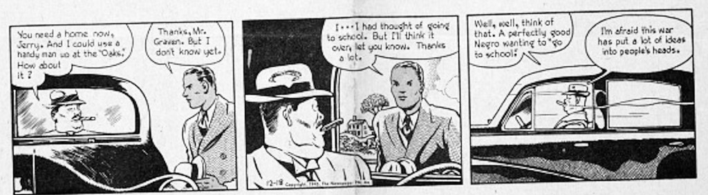 The strip took on racism a bit more obliquely. The heroic savior of Hank’s squad, Jerry Green, returns with college ambitions. A rich landowner offers him a job as handman for his estate. When Jerry politely declines, the cigar-chomping white man grumbles, “Well, well, think of that. A perfectly good Negro wanting to ‘go to school.’ I’m afraid this war has put a lot of ideas into people’s heads.”
