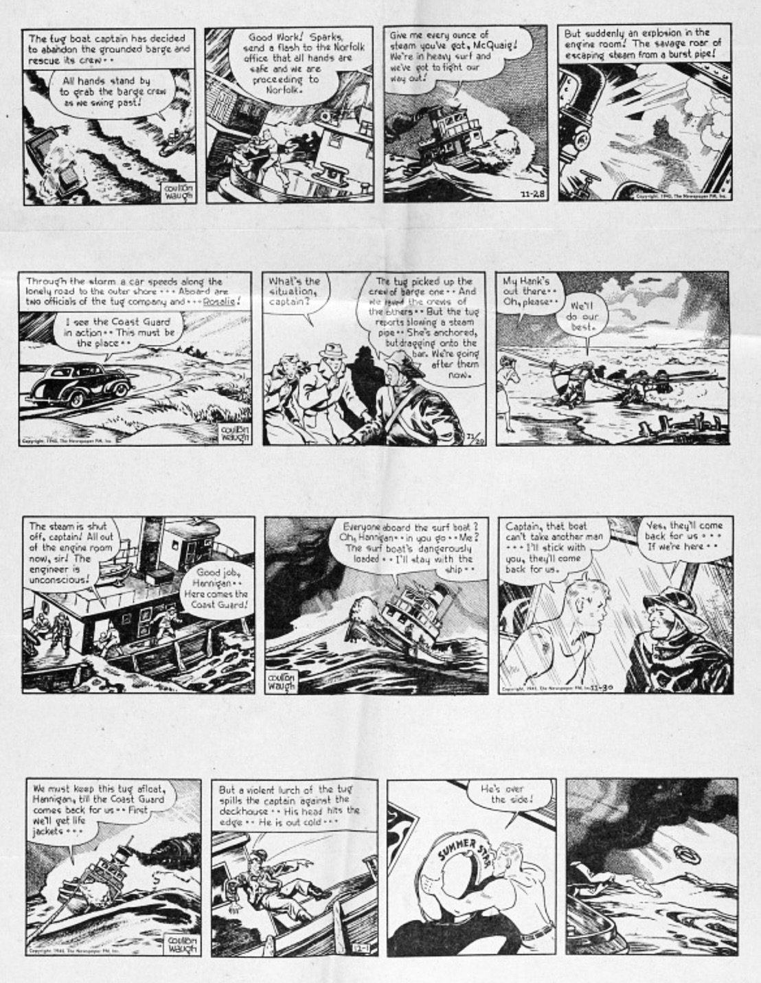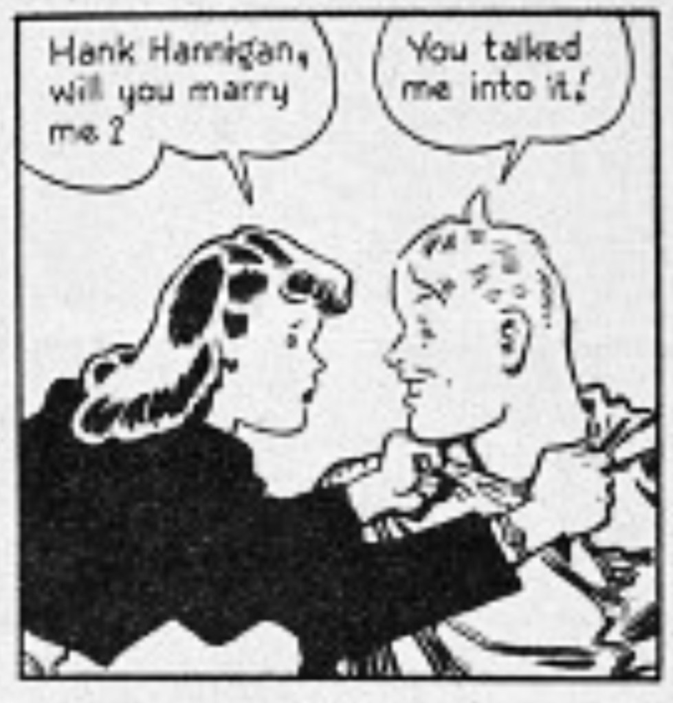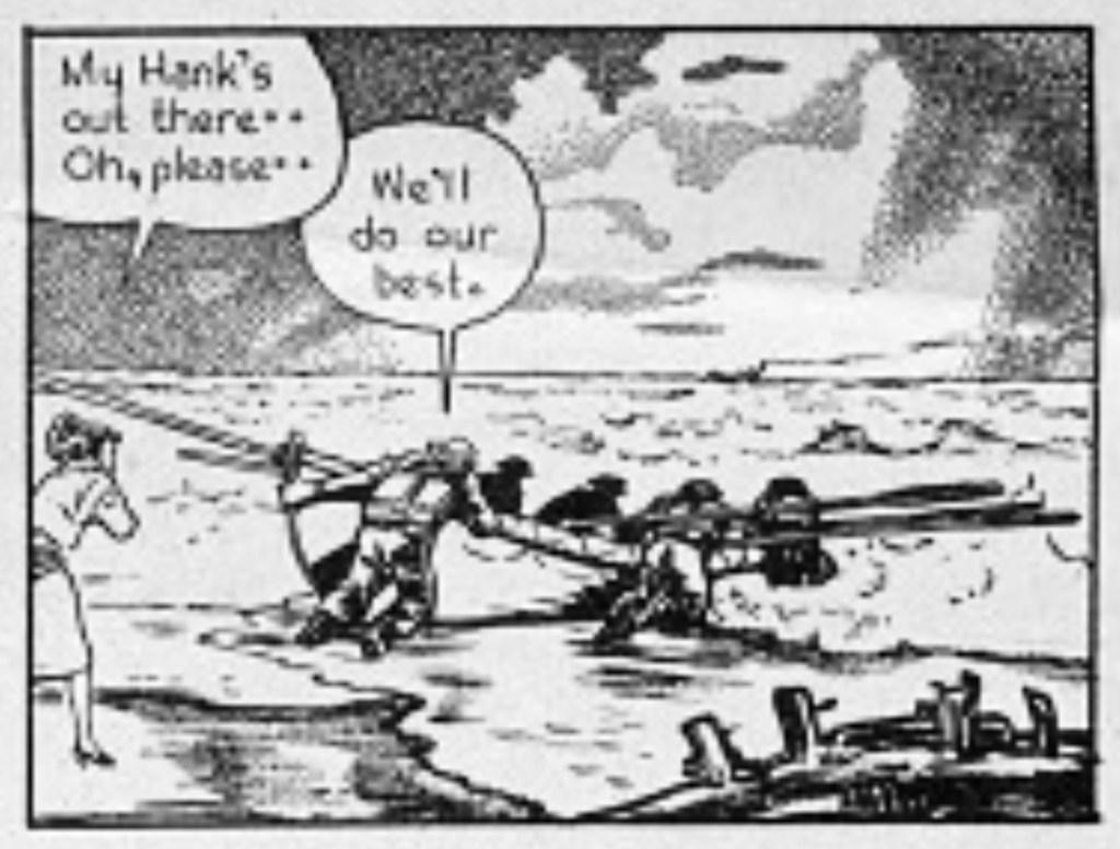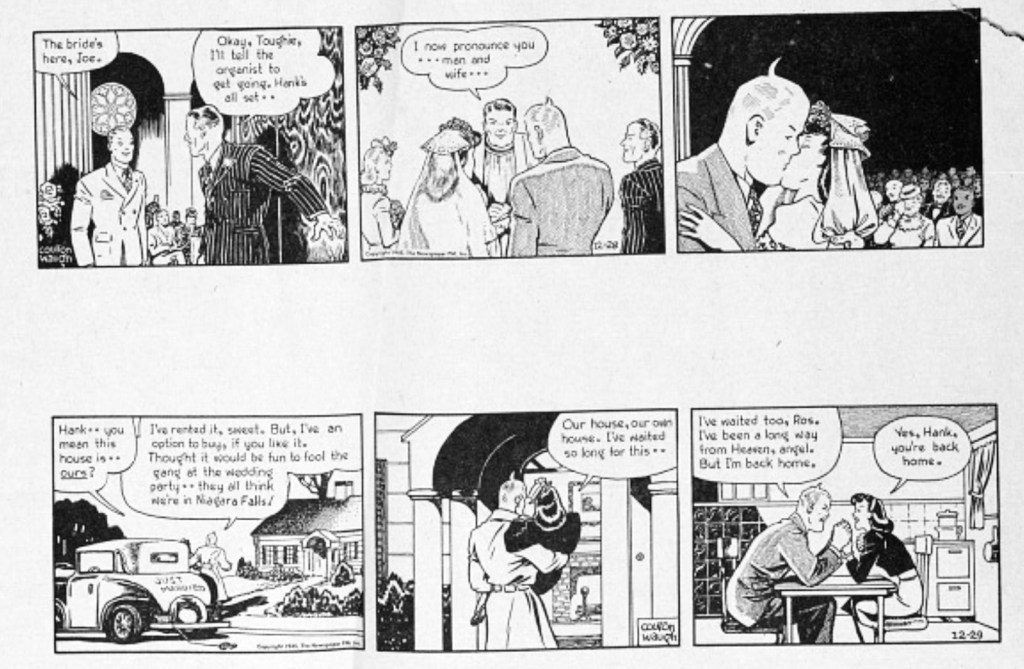 About halfway through Hank’s short run, both Waugh’s ideological flexes and design flourishes settle down along with the storyline. A series of familiar miscommunications, missing communications and misinterpretations send Hank and Rosalie on a twisty journey towards the marriage that ends the strip at the end of December 1945. Believing mistakenly that Rosalie has fallen for a rich rival, Hank takes to sea as a tug boat mate. The ship gets swamped; Hank jumps overboard to save his unconscious Captain; then he himself gets saved from the storm, leading to a romantic reunion and Hank and Rosalie’s hometown marriage in Trueburg, N.J. (Yes, Trueburg). The sequence allows Waugh to exercise an uncharacteristic but beautiful naturalism in rendering the storm. Waugh’s father was a noted marine artist.