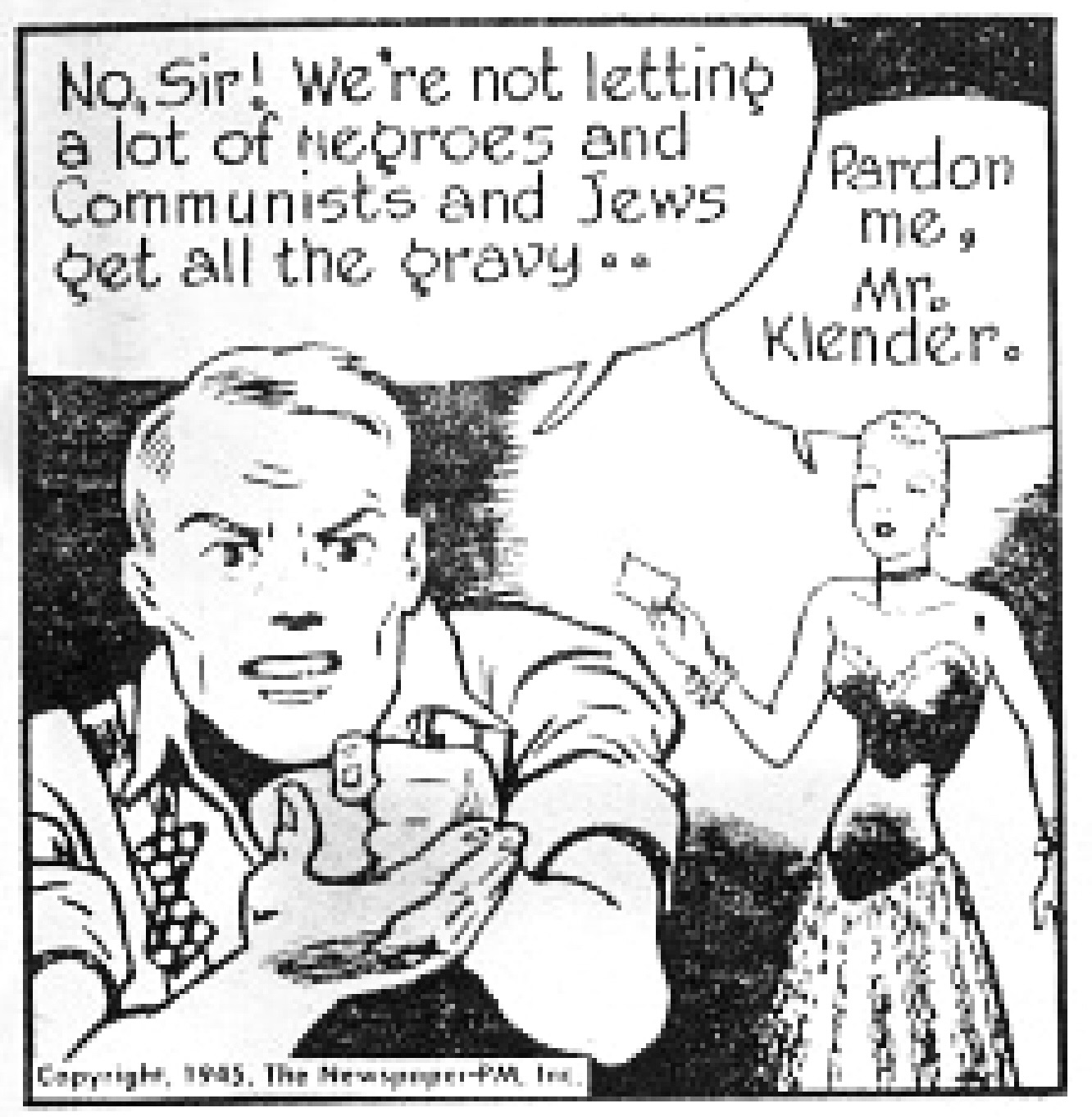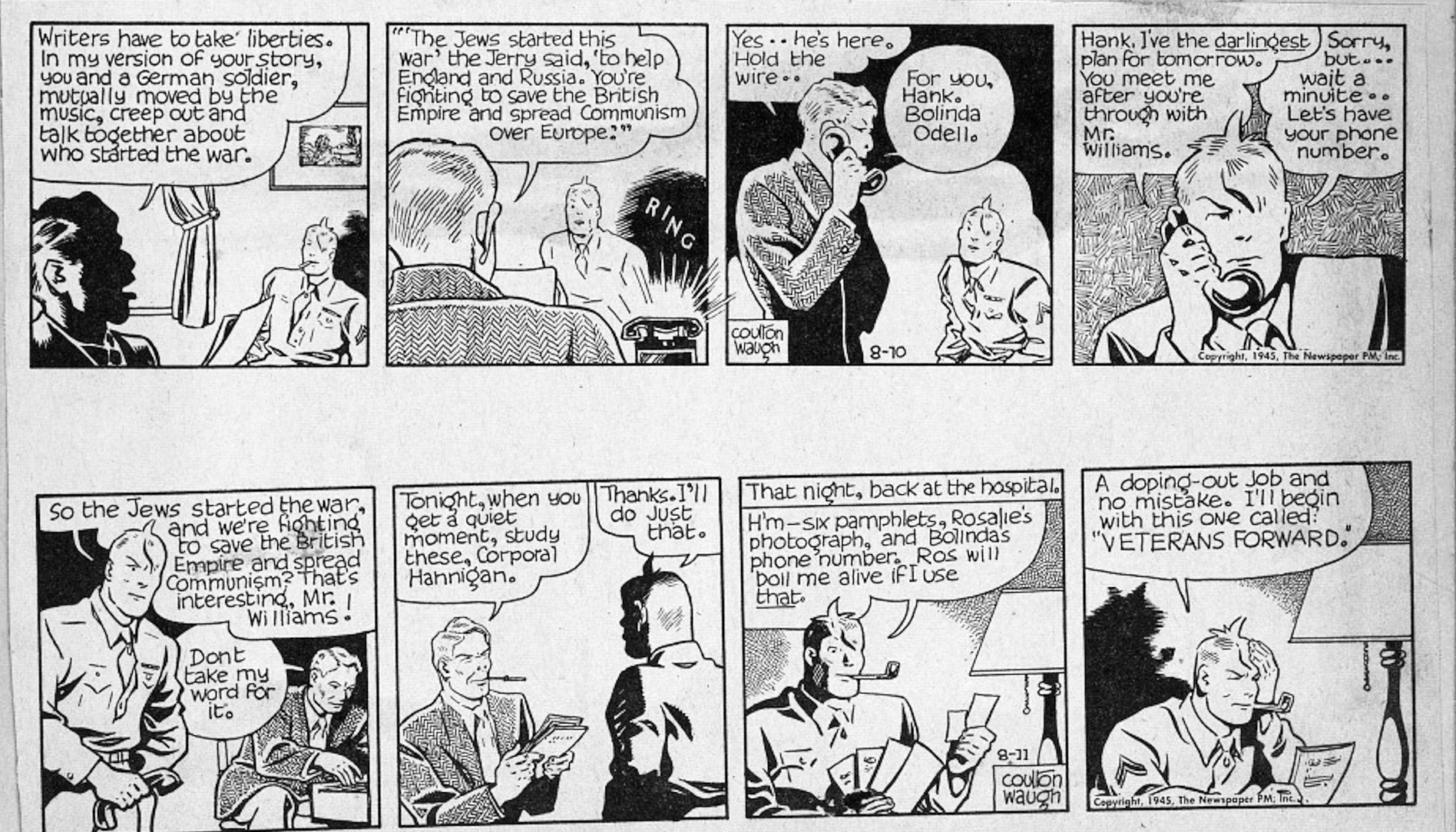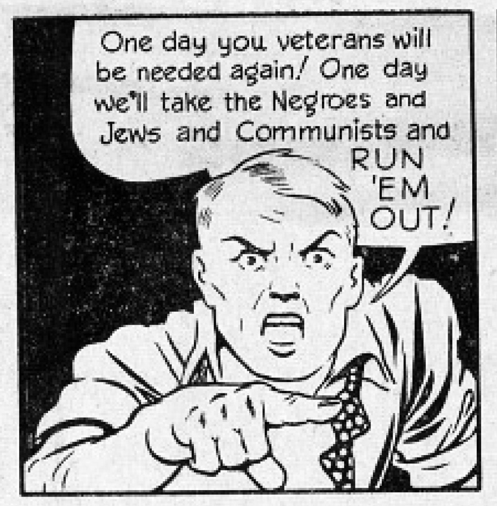 Hank will need that native ability to “dope things out” soon enough. The departed Killwitz left behind a diary with thoughts about how “everyone should dope things out, that fascism could even happen at home,” Hank recalls. Soon enough, a “Veterans Forward” league of nationalists tries to co-opt Hank into being their spokesman. Ultimately, Hank and a journalist pal infiltrate and expose the conspiracy as well as its racist nativism. “One day, we’ll take the Negroes and Jews and Communists and RUN ‘EM OUT!” one rally speaker barks out from a panel. Waugh was fictionalizing a storyline that PM’s own journalists reported at the time about secret connections between European fascism and American political and industrial factions.