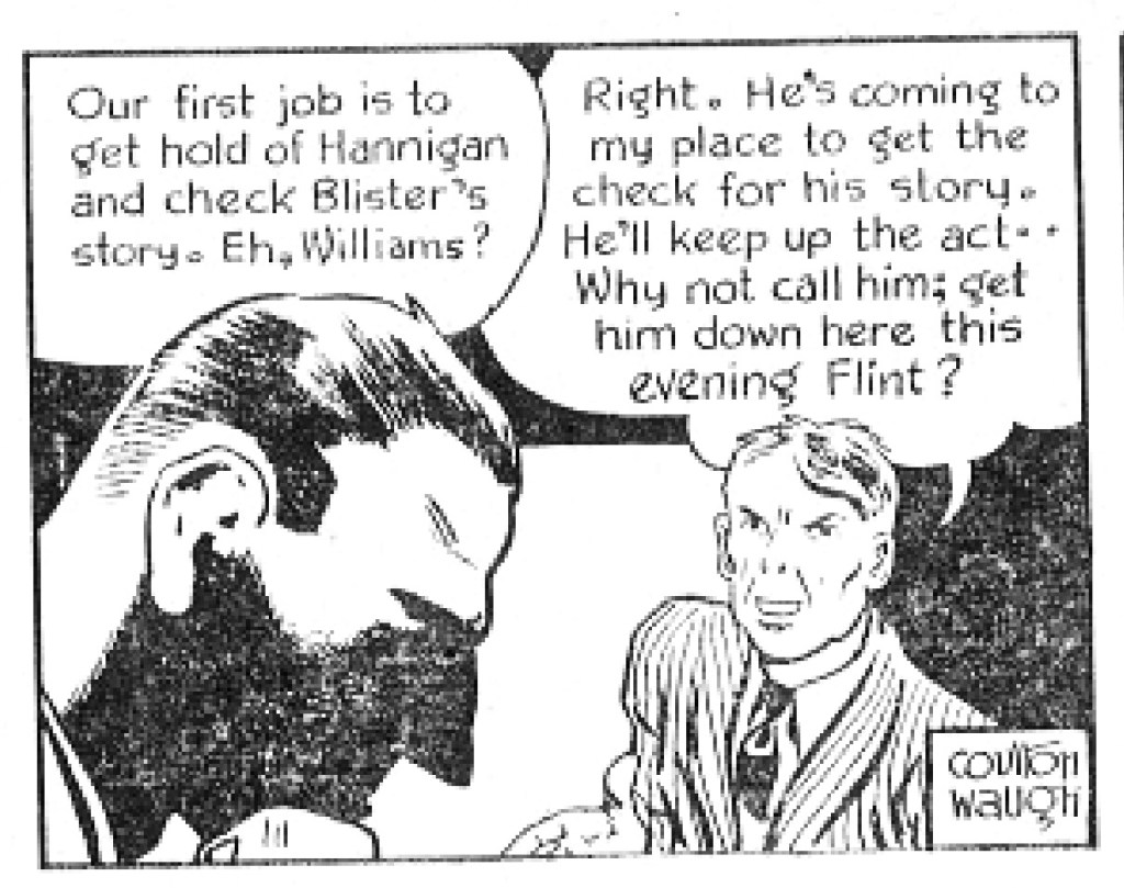 While Waugh lathers on the populist didacticism pretty thick in Hank’s first months, he leavens it with genuine intrigue and action. Woven into the anti-fascist conspiracy is a wonderfully drawn femme fatale who falls for Hank and a flurry of romantic missteps with girlfriend Rosalie. More impressive was the artist’s graphic experimentation. Waugh had a clean thick-lined style and use of deep shadows that seemed to channel the WPA poster art of the 1930s. He used light dabs of shadow to define face and clothing. His cityscapes were minimalist but precisely outlined, again, more by shadows than detail. Individual panels often carried a poster-like punch. His characters might speak directly to the reader with fist-pounding certainty and Soviet poster-art vibes. And Waugh loved playing with patterns – stripes, mottling, polka dots – with some eye-popping spotting around his panels. He even played with typography and speech balloons. His sculpted lower-case lettering often went white against a black balloon. Overall, he achieved an adventure strip style that stood apart from Roy Crane’s cartoony approach in Buz Sawyer, Alex Raymond’s Rip Kirby photo-realism and blotchy chiaroscuro of Caniff’s Steve Canyon.