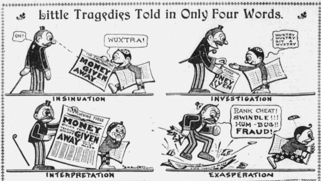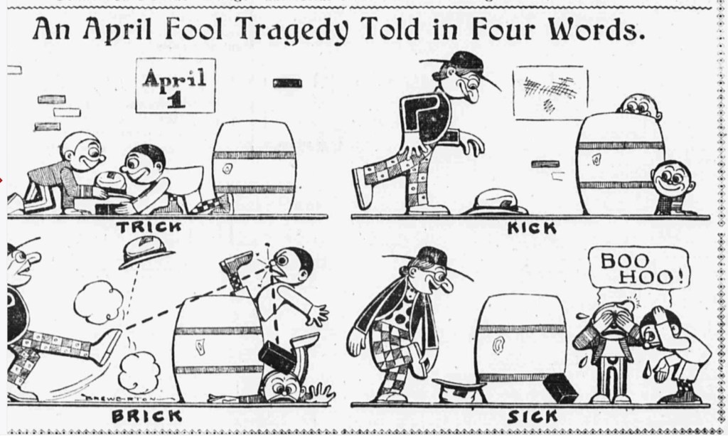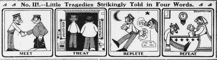 Brewerton not only runs out of steam but may have run out of ideas. Late in its run, the strip above steals directly from its partner on the World’s weekday page, The Importance of Mr. Peewee. That much more famous and successful strip is now accepted at the first true recurring daily franchise. The diminutive braggart Peewee is the center of the action, but every panel featured bystanders reading newspapers with sensational and deceptive headlines. Thia was Pulitzer’s World poking at Hearst’s even more provocative tabloid Journal.