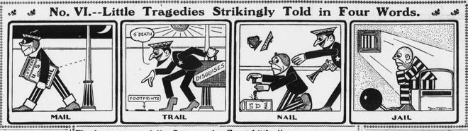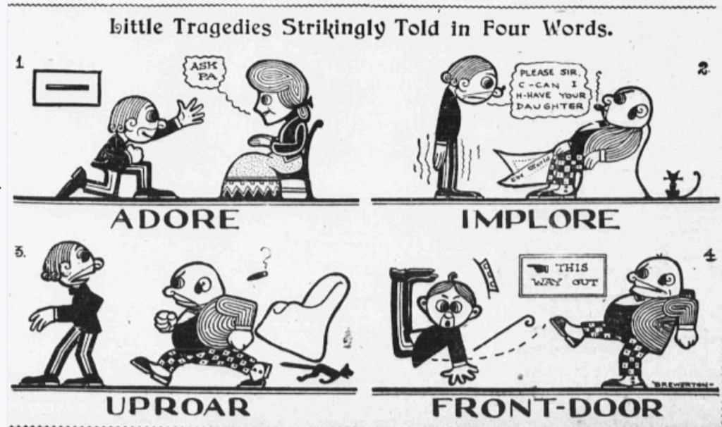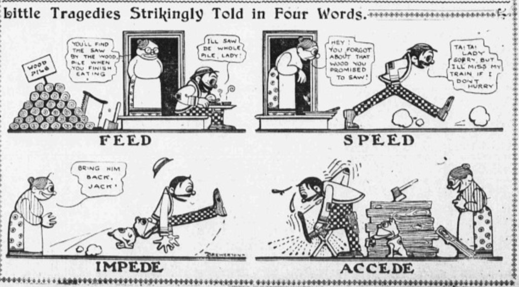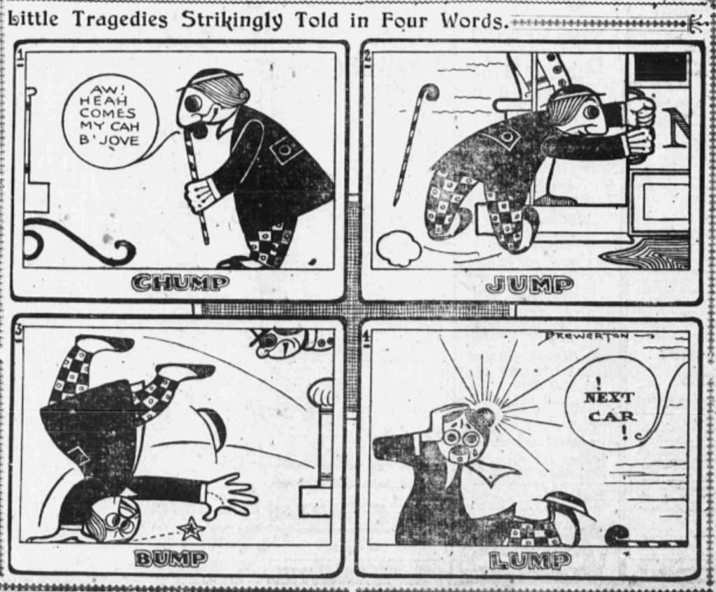 There were no firm rules for comic artists during that first 10 or 15 years of newspaper strips. Formats, aesthetic conventions, even panel shapes and limits hadn’t been fully established. The medium was still elastic. And so we see in these years wild experiments in artistic styles, unfettered explorations of page and the panel structures, even testing different interactions of words and image. Little Tragedies Strikingly Told in Four Words contains that spirit in its own title. It frames itself as an experiment. Crafted by the otherwise forgettable Alfred W. Brewerton for the New York Evening World between Oct. 1903 and June 1904, it was an unusually long-lived title to appear several times a week. True to its title, the strip is indeed striking because it blends pantomime and text in a novel way that is also compact, highly stylized, even wry. It recalls that famous quip about Ernie Bushmiller’s Nancy being easier not to read than to read. And like Nancy, the strip gets at something elemental about how comics work.