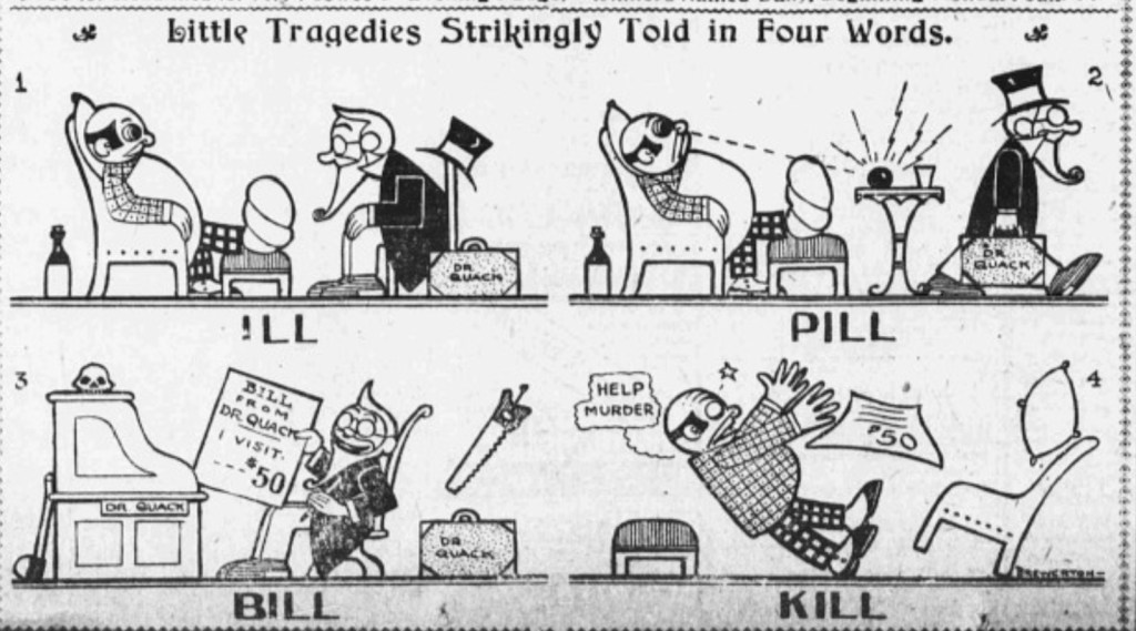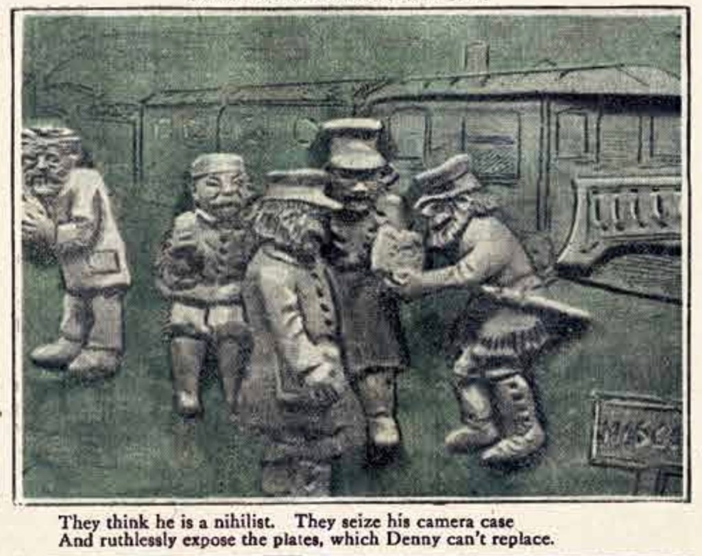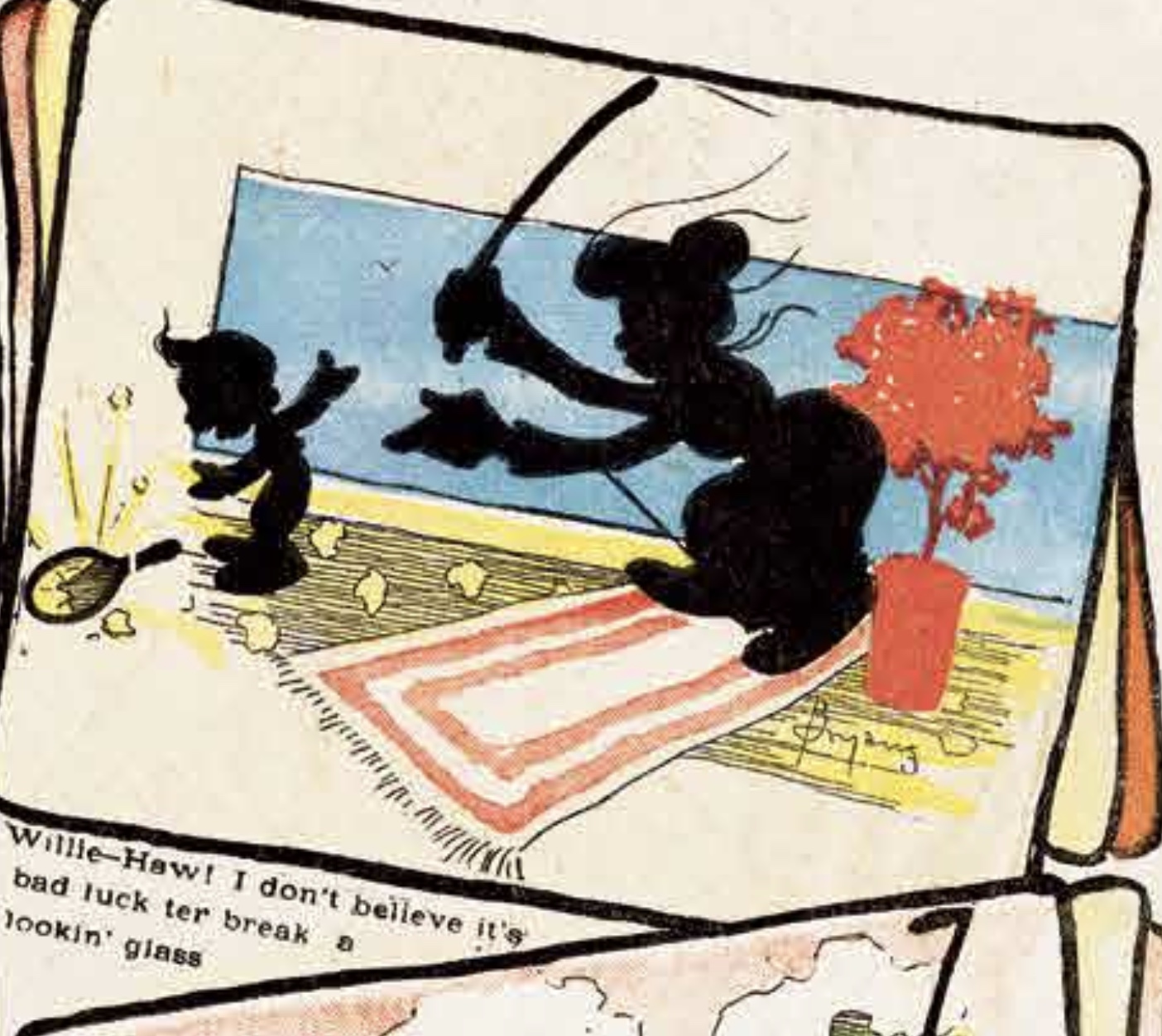 Little Tragedies was just one of many early strips that alluded to older, simplified art styles to test ideas for the evolving medium. Peter Maresca’s Society Is Nix collection is a trove of these visual explorations. Jack Bryan, for instance, specialized in silhouettes. In 1910 C.A. Beaty photographed sequences of clay reliefs, added captions, and built a sculpted comic strip.