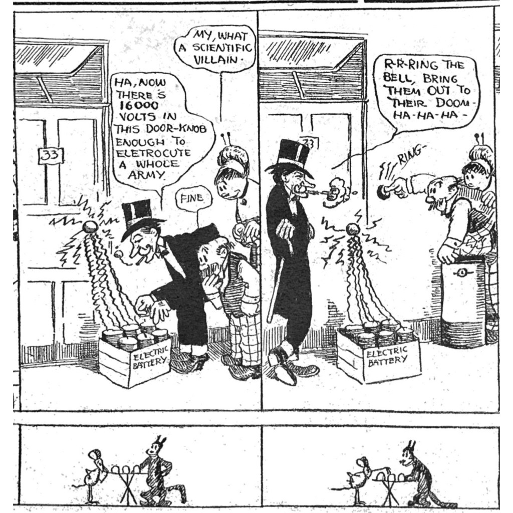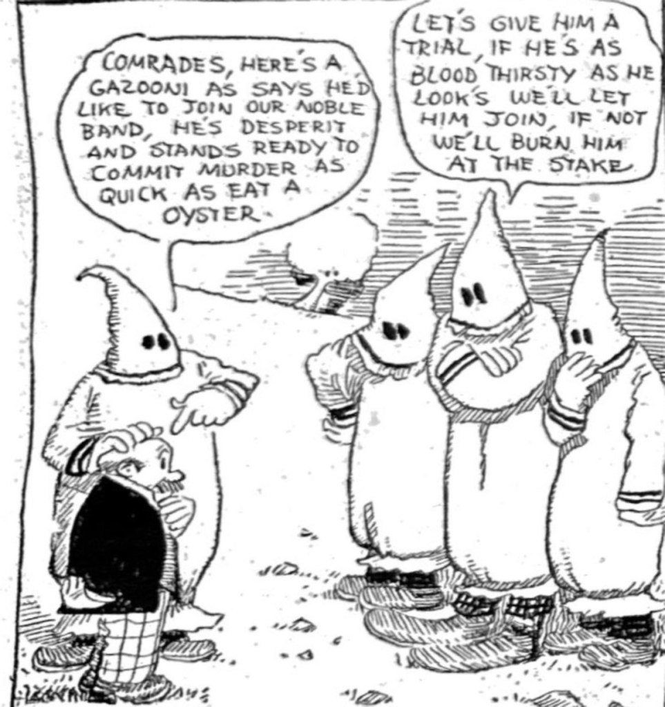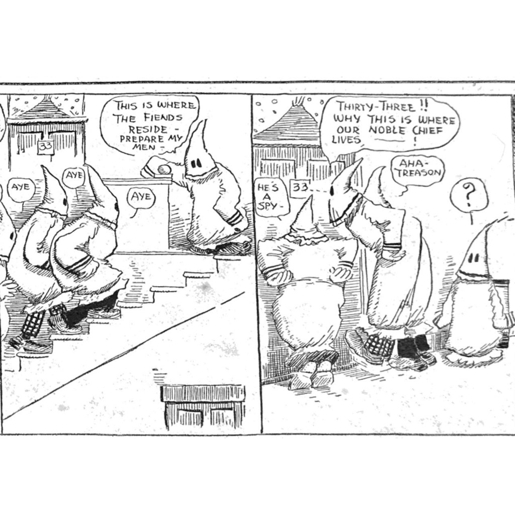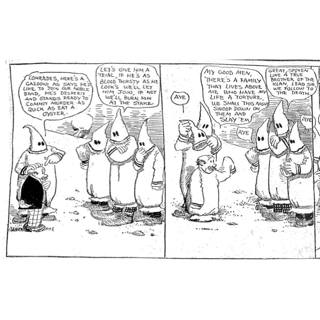 But calling in the KKK was extreme even for the day, and is jarring to modern eyes. But this bit of weirdness demonstrates how outlandish Herriman could get in this strip. In 1910, the Ku Klux Klan had not yet been revived since its deadly rampage against Reconstruction efforts in the 1860s and 70s. But its savage reputation endured in popular culture. Its revival in 1915 was inspired by D.W. Griffith’s fawning depiction of the Klan in his dubious masterpiece “The Birth of a Nation.” It is even more remarkable that Herriman, who was Black but “passed” as white, invoked their murderous legacy here. And as E. Pluribus discovers in the kicker panel, the Klan is nothing to play with.