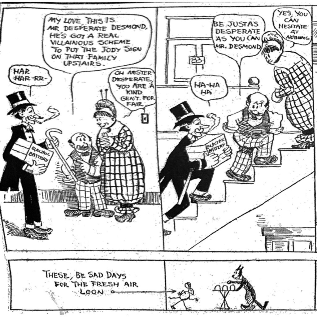 Along with chaos, mayhem and violence, obsessive behavior was a core theme of early newspaper cartooning. Consider the many titular anti-heroes of these years, like Hungry Henrietta, Superstitious Sam, Jingling Johnson, Sammy Sneeze. Or the irrepressible raging “Outbursts of Everett True,” the sex addiction of Mr. Jack, the insufferable politeness of Alfonse and Gaston, or the numerous strips about absent-minded codgers or irrepressible pranksters. Seen through the lens of early 20th Century comics, the new American cityscape was characterized by obsessive behaviors, idiosyncratic personalities, uncontrollable ticks – compulsions of every sort. The annoying monomaniacs in our midst formed the heart of early comics. It was an art well-suited to the daily newspaper: a comedy of everyday frustrations and observations.