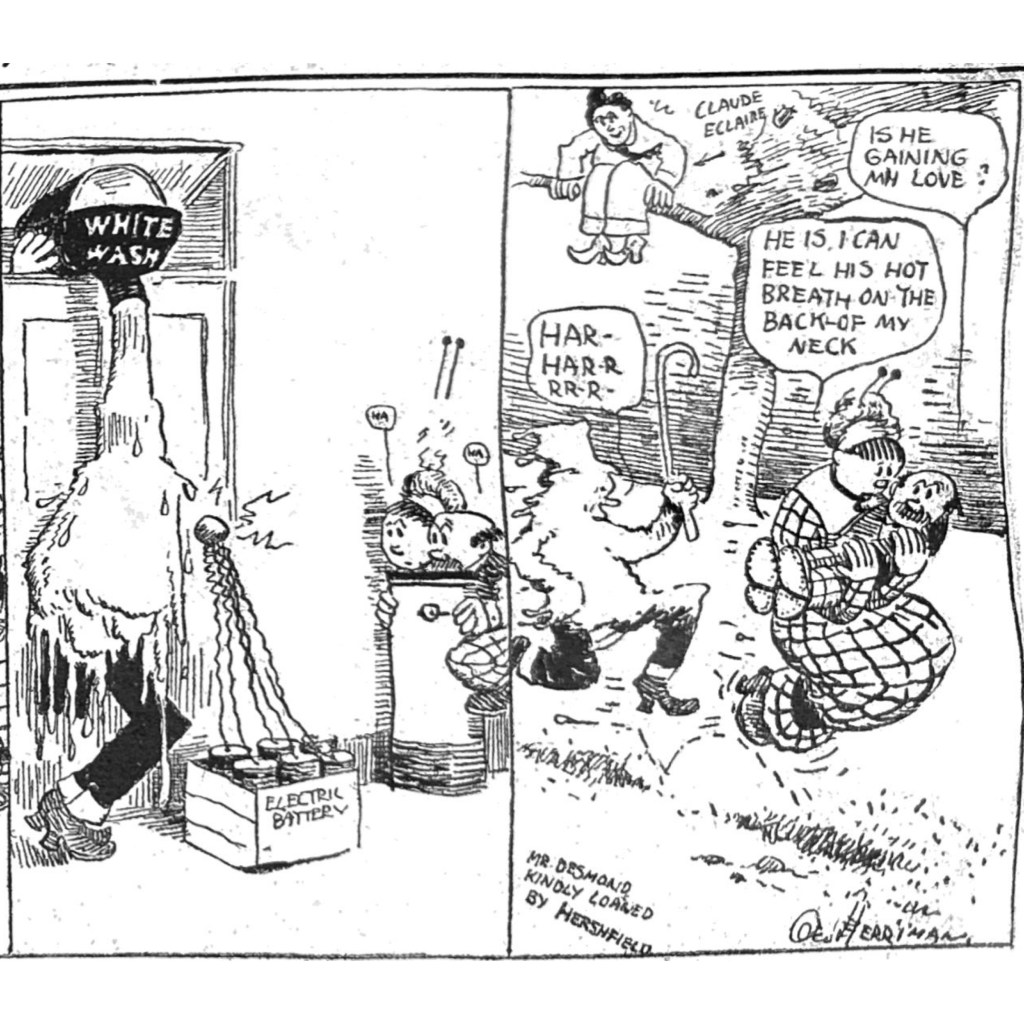 But calling in the KKK was extreme even for the day, and is jarring to modern eyes. But this bit of weirdness demonstrates how outlandish Herriman could get in this strip. In 1910, the Ku Klux Klan had not yet been revived since its deadly rampage against Reconstruction efforts in the 1860s and 70s. But its savage reputation endured in popular culture. Its revival in 1915 was inspired by D.W. Griffith’s fawning depiction of the Klan in his dubious masterpiece “The Birth of a Nation.” It is even more remarkable that Herriman, who was Black but “passed” as white, invoked their murderous legacy here. But as E. Pluribus discovers in the kicker panel, the Klan is nothing to play with.