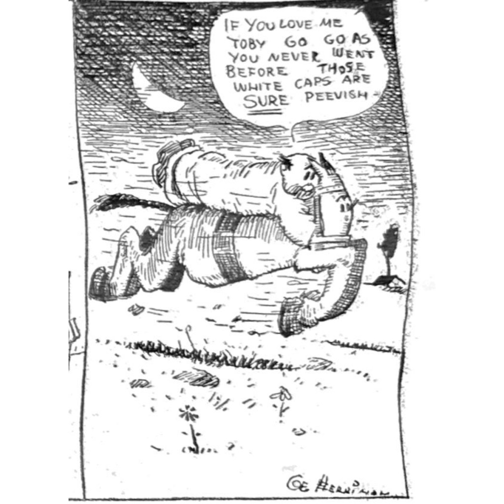 The best cartoonists took this trope and fashioned it into wonderful art. The cast of Gus Mager’s wildly popular “Monks” strips was comprised of characters whose personae were dominated by a single trait (Henpecko, Groucho, Joko). Mager developed this cast of single-trait types into a grand satire. And Herriman, bless him, focused cartooning’s predilection for exploring mania and obsessive single-mindedness onto an everyday middle-class schlub and the claustrophobic frustrations of modern apartment living. This is when popular art becomes great, when artists glean and dramatize the vague underlying anxieties and conflicts in a concrete, compelling way.