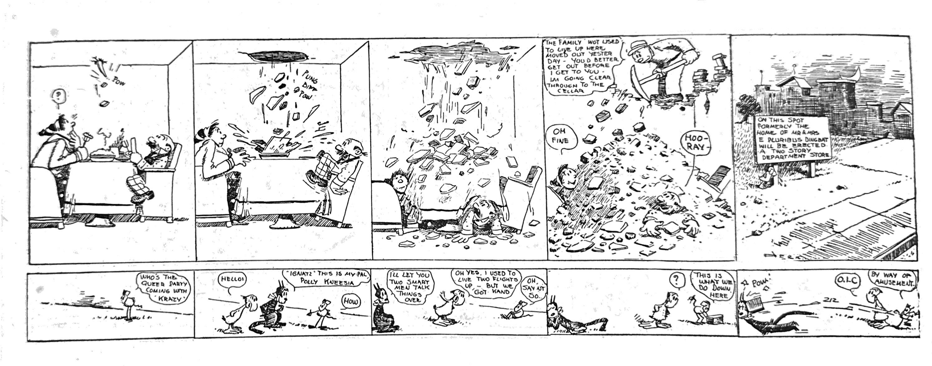 It is fitting that E. Pluribus’s grandly eccentric and escalating obsession with the family upstairs ends, as perhaps it must, apocalyptically. Herriman brings the strip to a mostly satisfying conclusion by cutting off the source and even the setting of his hero’s torment. The obsession is not resolved, because his nemesis simply moves away without a big reveal. But somehow for Herriman, simply installing better neighbors is not enough of a denouement. He had to bring down the house.