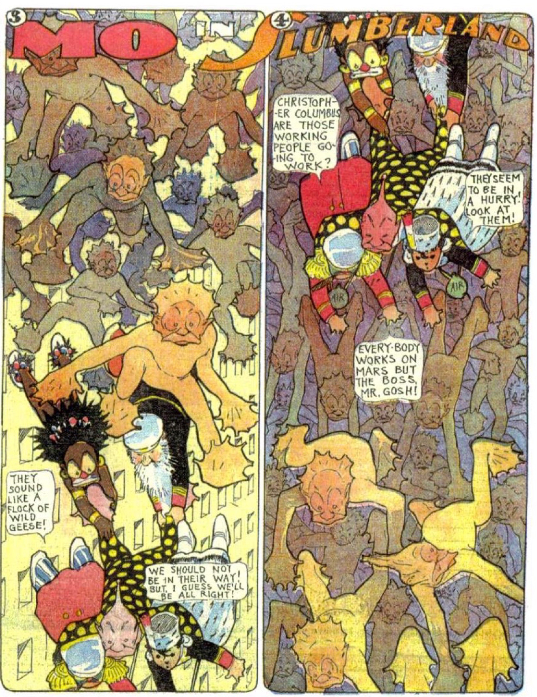But here, McCay deploys his artistic genius to illustrating the sense of suffocation, anonymity, despair among a people oppressed rather than liberated by modern “progress.” The caverns of Mars skyscrapers are so tall that sunlight must be shipped in. Workers are punished for trying to access genuine sunlight, and they are not allowed to cheer during sporting events. B. Gosh himself is a robber baron in the classic mold, rarely seen but ever-present in name. The dystopia is narrated through his assistant, with Gosh himself occasionally barking in commands from off stage. When rebellious pirates kidnap Nemo, Gosh defeats and captures them. But Gosh’s assistant admits the boss will most likely turn the rebel chief into a personal advisor. “Old Gosh is a robber himself or he’d not own everything,” his assistant tells Nemo.