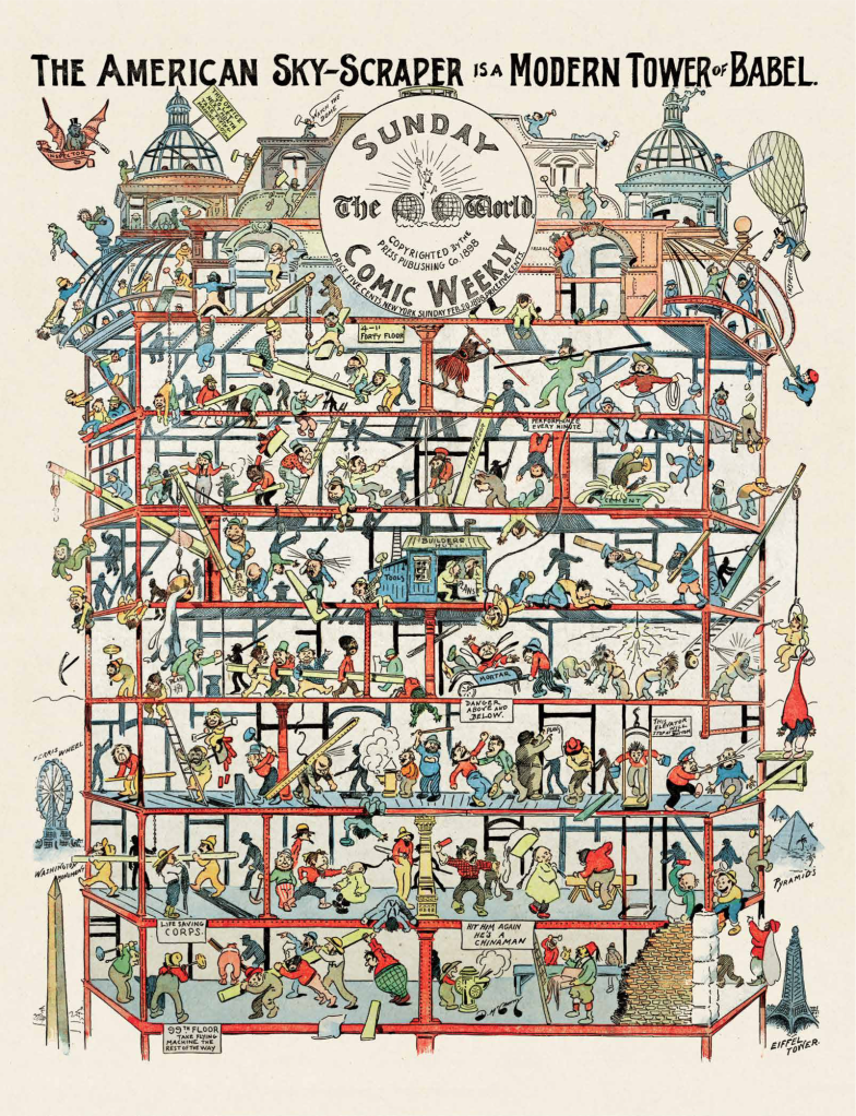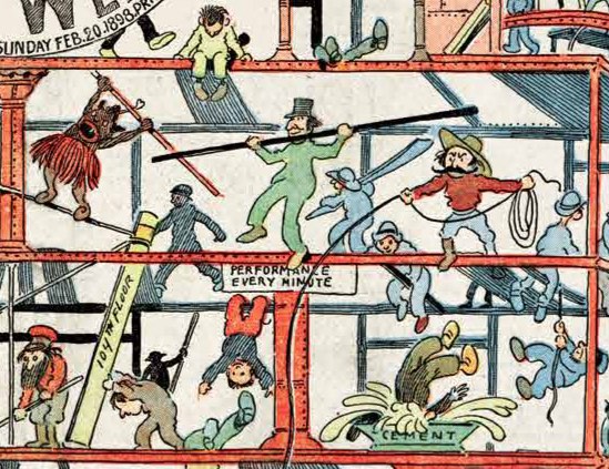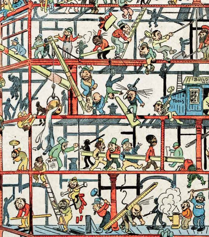 The Hurry Up New Yorker is one of the many fleeting experiments in comic arts in this first decade of the form, but it brings some fresh perspectives on the urban and personality tropes that characterized so much of early comics. Like many strips in this second decade of the form, it is a single joke repeated regularly. The most popular strips of the day riffed on a weekly or daily basis on a single gag: the Katzenjammers’ prankishness, Happy Hooligan’s well-meaning haplessness, Mr. Jack’s infidelity, Buster Brown’s impishness, Sammy’s sneeze.