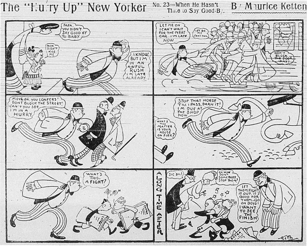 The modern (circa 1910s) middle-class New Yorker pushing arrogantly through family, workers, pedestrians, crowds, even his or her own children – is the simple trope driving Maurice Ketten’s 1906 month-long run of Hurry Up New Yorker in the New York World. Ketten projects this trait onto a range of characters, male and female, across the brief run, but reiterates a core hypocrisy as the central gag. The final panel sees the harried and busy urbanite suddenly finding the time to watch a street fight, monitor a football score, gossip with a friend, watch a fire.