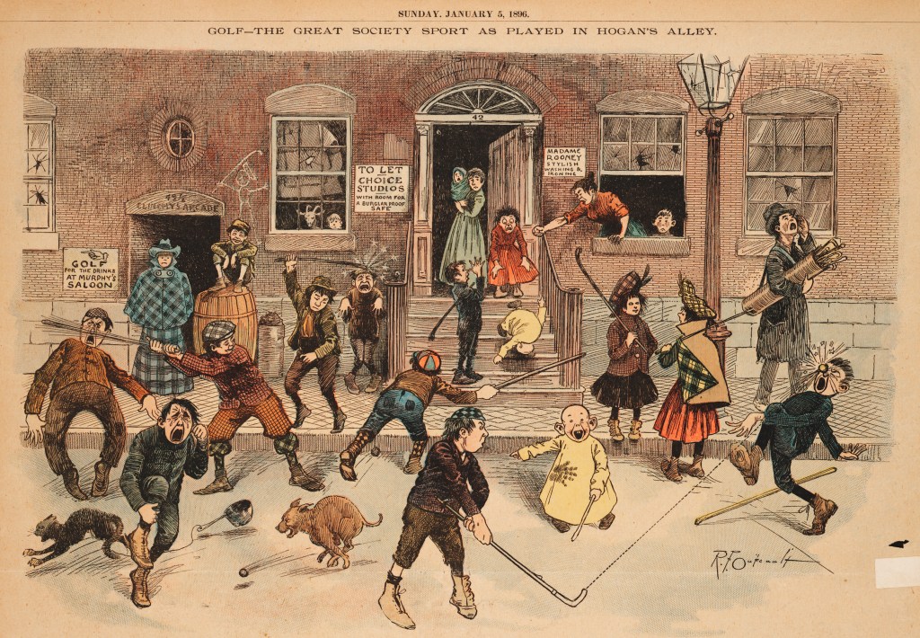 Look at the range of action, emotion and moods that co-exist in this simple “Golf- The Great Society Sport As Played In Hogan’s Alley” (World, Jan. 5 1896). the tableaux is the sum total of many individual set pieces. Stray balls and sticks comically assault urchins. Meanwhile on the stoop alone there are multiple planes of action. A girl fumbles a toddler, echoing the accidental violence from the street. Likewise, a boy taunts one of the enraged or saddened Irish mothers (also on this same stoop) that often populate Outcault’s tenement backgrounds. Right before this stoop we get two calm girls conversing, while to the side an older urchin tries to sell golf clubs for the affair. And this describes just a portion of what goes on across multiple planes of action in most Outcault Yellow Kid tableaux.