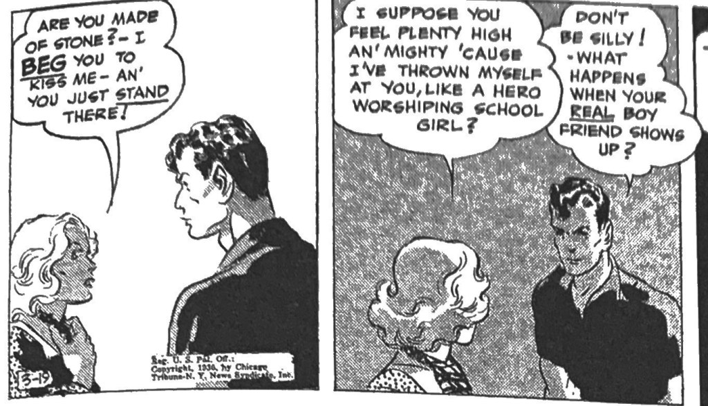 We revere Milt Caniff’s Terry and the Pirates quite rightfully as the apex of the adventure strips. His evocative use of frame, staging, rhythms, ink and line (or blobs), setting, landscape, story arc – all set new and high standards for comic art in the 1930s and 40s that define the form. But as I read through the strip from its beginning I am struck by the pop psychological dimension of the strip. So much time is spent on characters musing on one another’s motives, gaming one another’s psychology, and especially mapping the contours of ideal manhood and the war of the sexes.