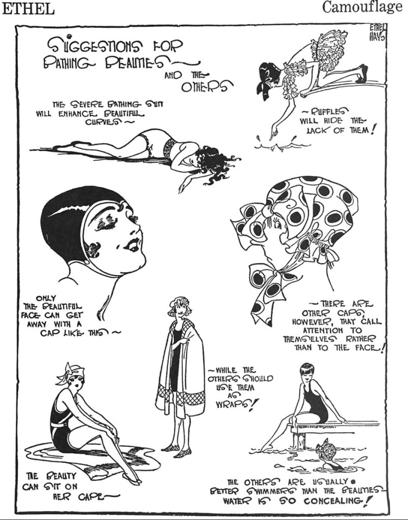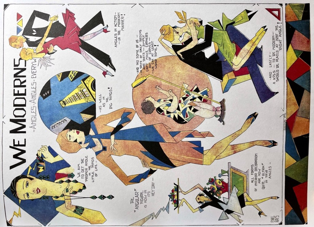 Hays’s “We Moderns” piece at the top of this entry is a great example of the creative richness and thoughtfulness we miss when, like their editors at the time, we consign women cartoonists of the day to the “fashion” artists bucket. Indeed, Hays, Brinkley and Huget not only paid attention to clothing, hair and even body styles, but they wove these concerns in with larger social, personal and aesthetic ideas. In “We Moderns” Hays actually brings these threads together in a startling visual think piece. She links the “angles” of modern fashion with architecture, clothing, dance, personal politics and even her own Deco-infused art style. Nell Brinkley was adept at using her characters’ clothing as instruments of drama, personality, reaction. They exploded from the page as effectively as her signature facial expressions – signals of inner-feeling. These artists didn’t just depict the visual styles and fashions of the inter-war years. They showed a rare understanding of why they mattered.